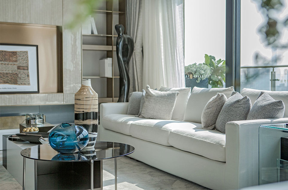 瘦长型电视柜,小型布艺沙发,意式岩板茶几,款式简约别致,以黑、白、灰为主色,与客厅的调性完美搭配。