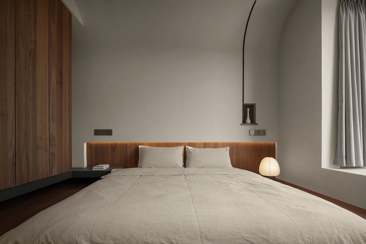 卧室是「城市观景台」与「私密庇护所」的共生体:抬高的木质床台如大地的延伸,内嵌灯带勾勒出悬浮般的轻盈;大幅窗景将天际线与绿意揽入室内,让睡眠成为「与自然共呼吸」的日常。弧形线条的墙面设计柔化空间棱角,搭配原木与素色床品,在极简中盛放着「归家即归心」的松弛力量。
