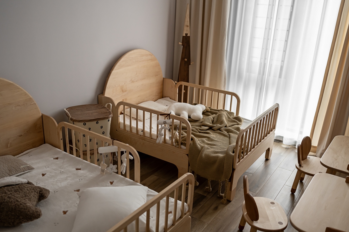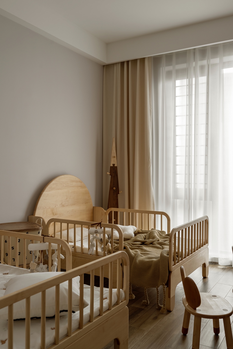 浅木色婴儿床与家具,带着天然原木的肌理温度,为孩子构筑安全柔软的成长天地。透光纱帘与棉麻织物的搭配,让阳光与微风成为房间的“常客”,每一处细节都在诉说:童年本该被这样的温柔包裹。