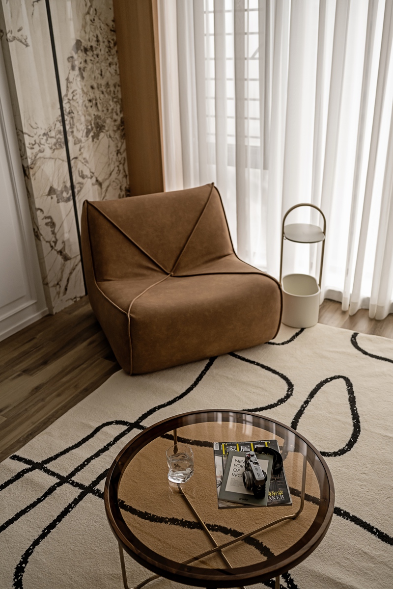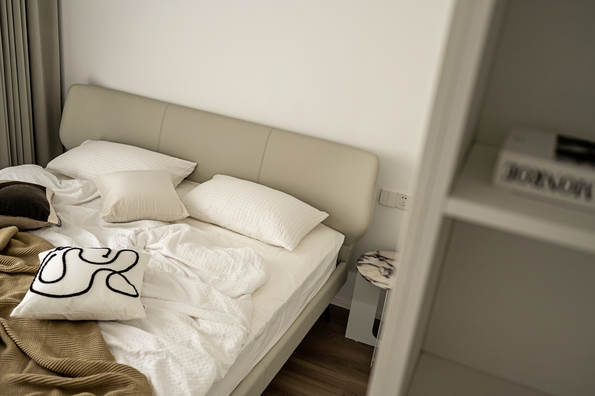 浅灰床头与棉麻床品,在光影中晕出慵懒质感;棕色针织毯的肌理,为空间增添触觉温度。床边小几的大理石纹理与极简造型,让“休憩”也成为兼具美学与舒适的体验,每一个清晨与夜晚,都在此被温柔接住。