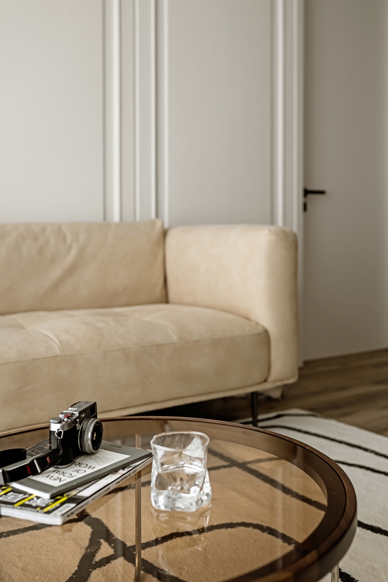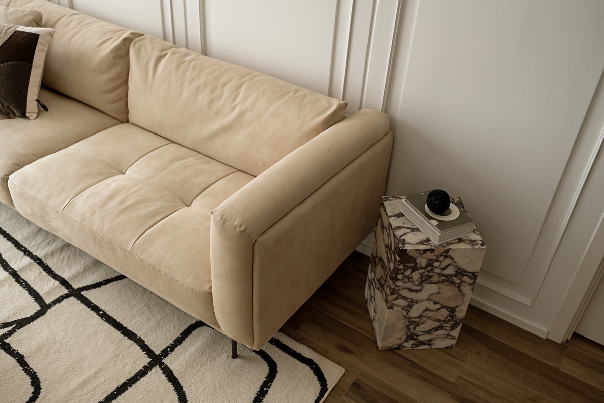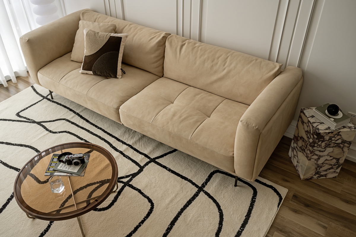米杏色沙发如同被阳光晒暖的软云,搭配几何感黑白地毯,让空间在柔和中透出利落。白色护墙板以极简线条勾勒秩序,透光纱帘滤过的光线,让整个客厅成为“可呼吸”的松弛容器,静坐于此,便能感知时光的慢淌。