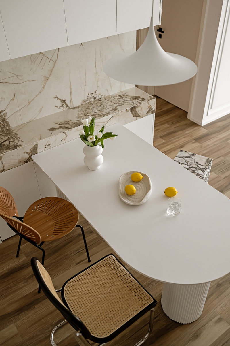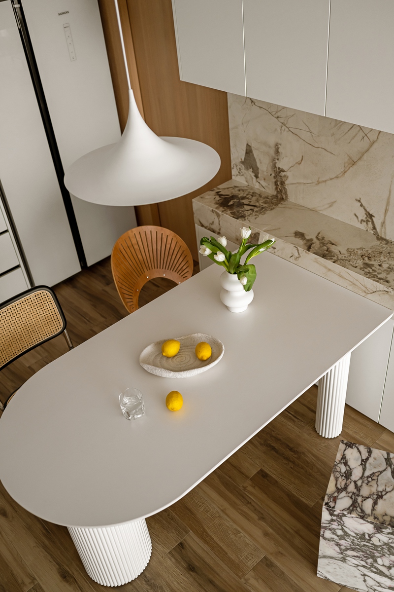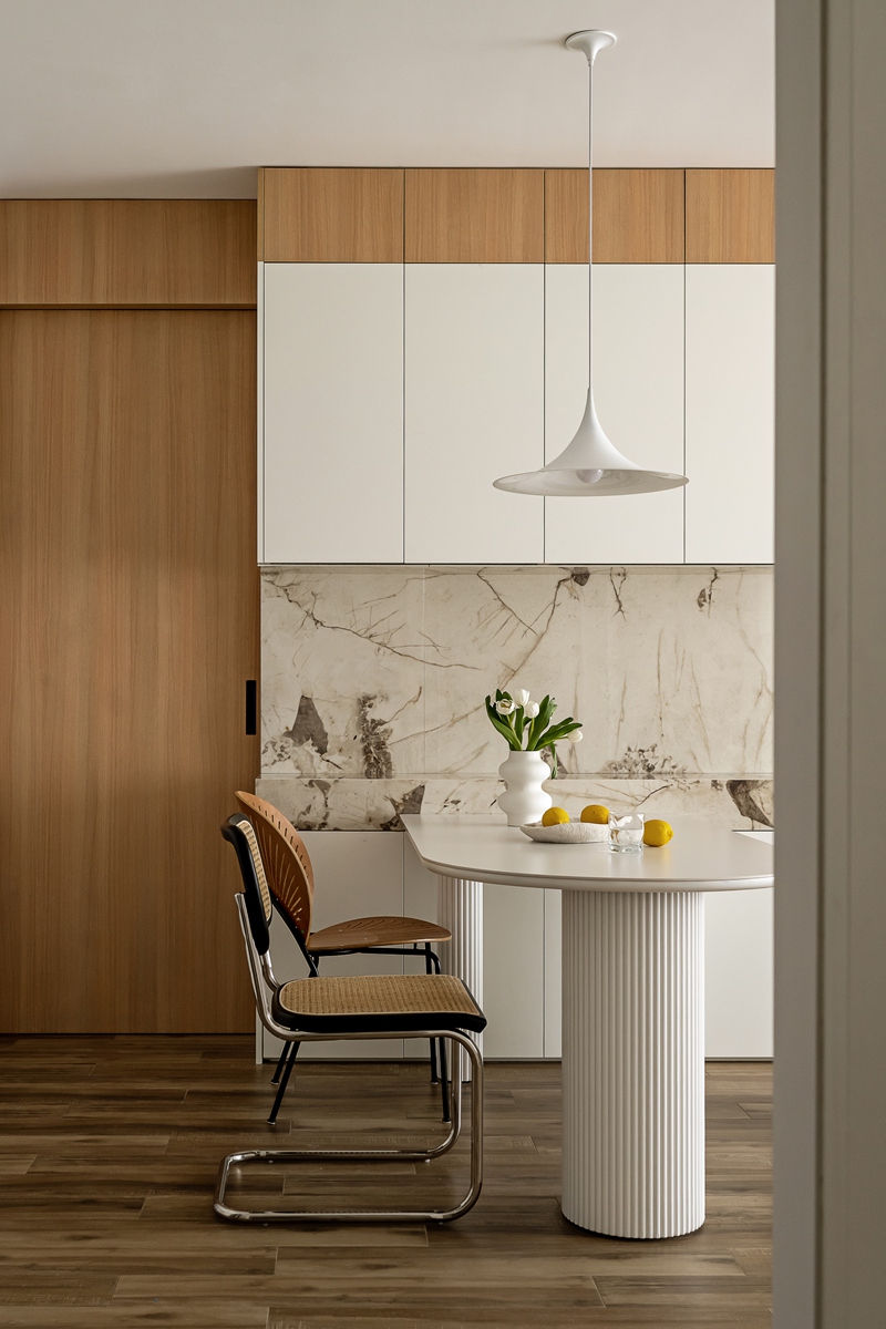 木质与大理石的碰撞,让餐厨区兼具自然温厚与轻奢质感。弧形餐桌的柱式设计自带艺术韵律,搭配藤编座椅的复古肌理,即使是日常三餐,也能成为一场“仪式感”的小剧场。大理石中岛与橱柜的简洁线条,让烹饪的烟火气,也染上了高级的底色。