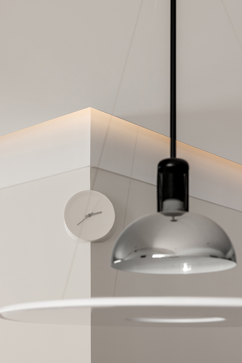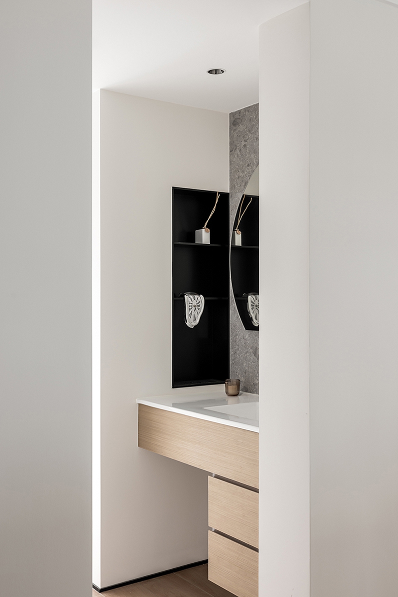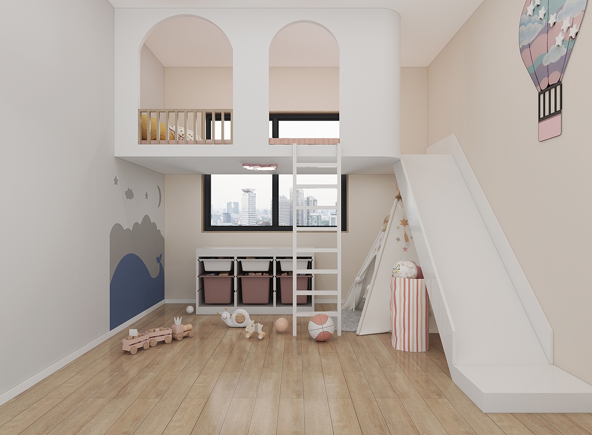 儿童区用拱形门洞、滑梯与梯架构建“秘密小天地”,柔和奶油色包裹空间,云朵装饰与圆形镜增添天真意趣;同时借由利落线条与一体化设计,让童趣不再杂乱,而是成为空间的灵动注脚。