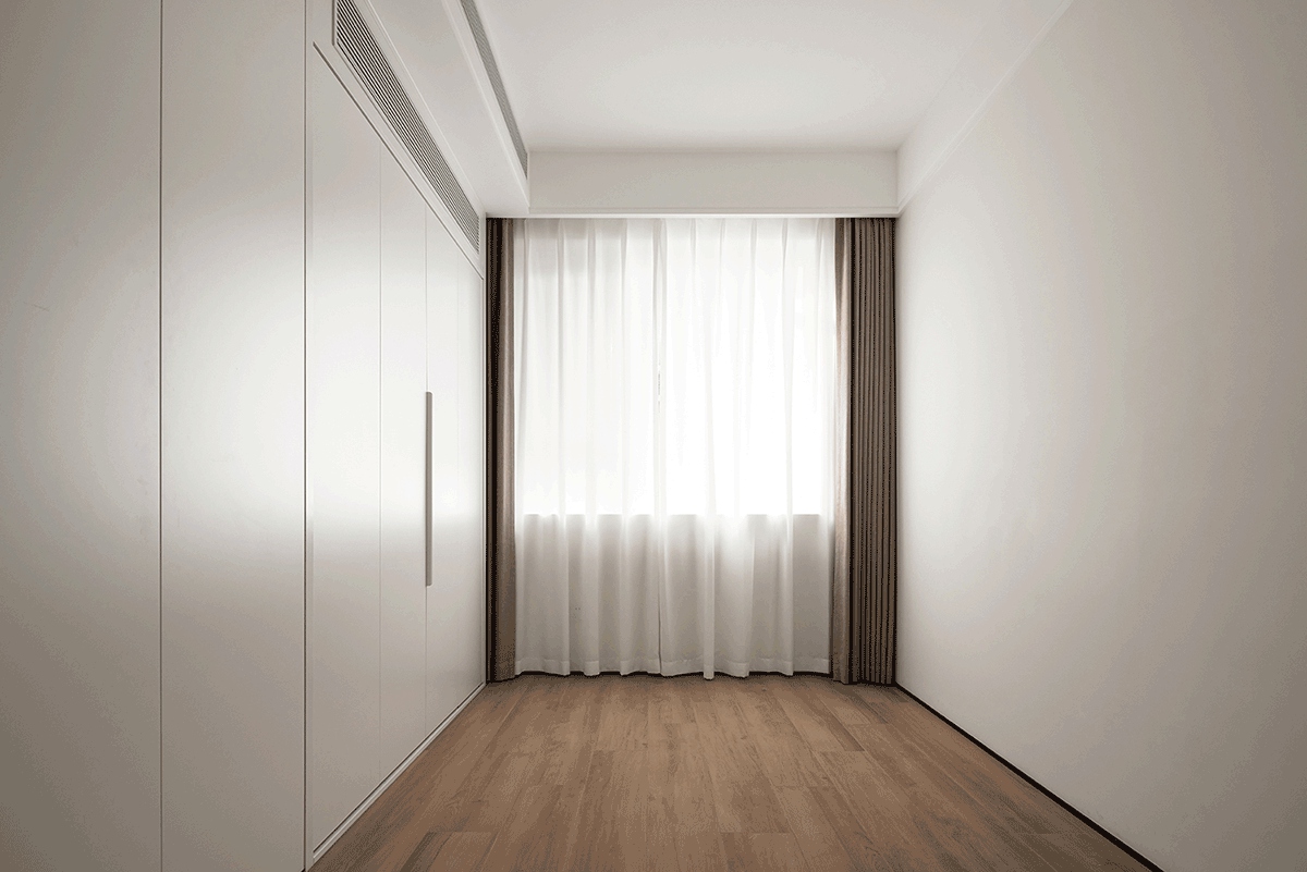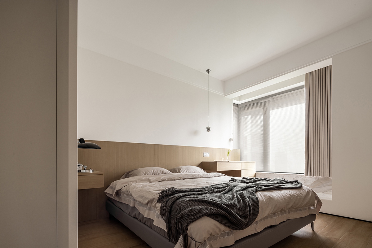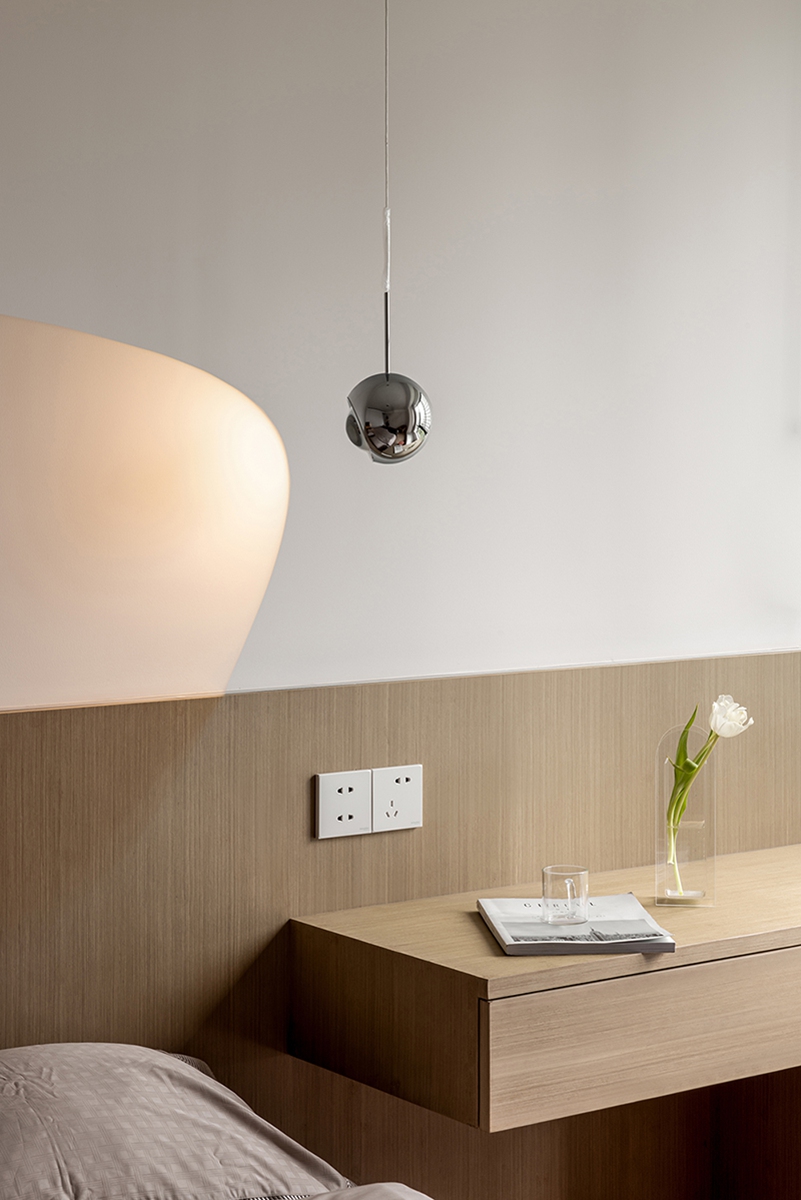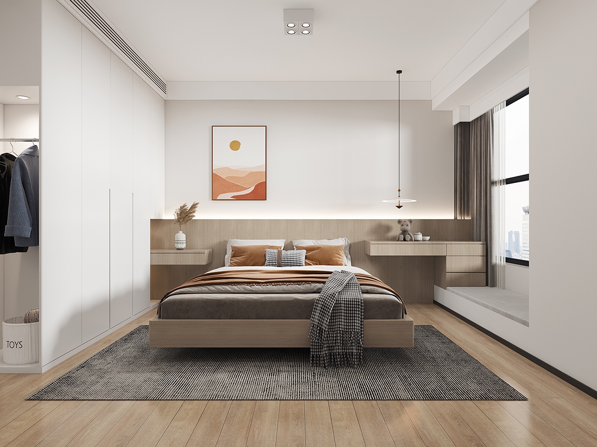 木调床头墙温柔包裹睡眠区,极简柜体收纳一切喧嚣,窗边书桌借自然光铺就工作与阅读的宁静场景,一毯一灯,都是卸下疲惫的温柔信号。
