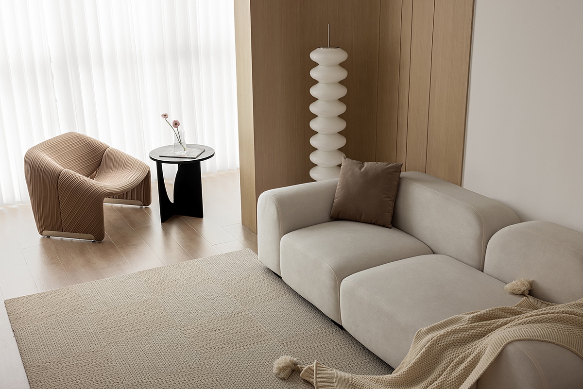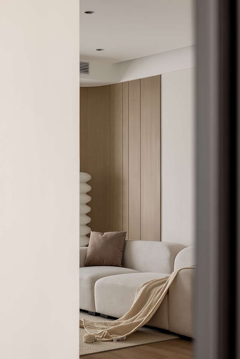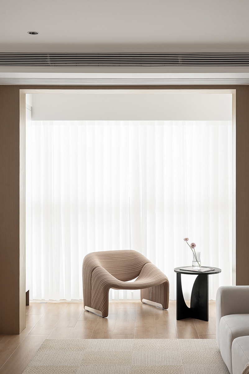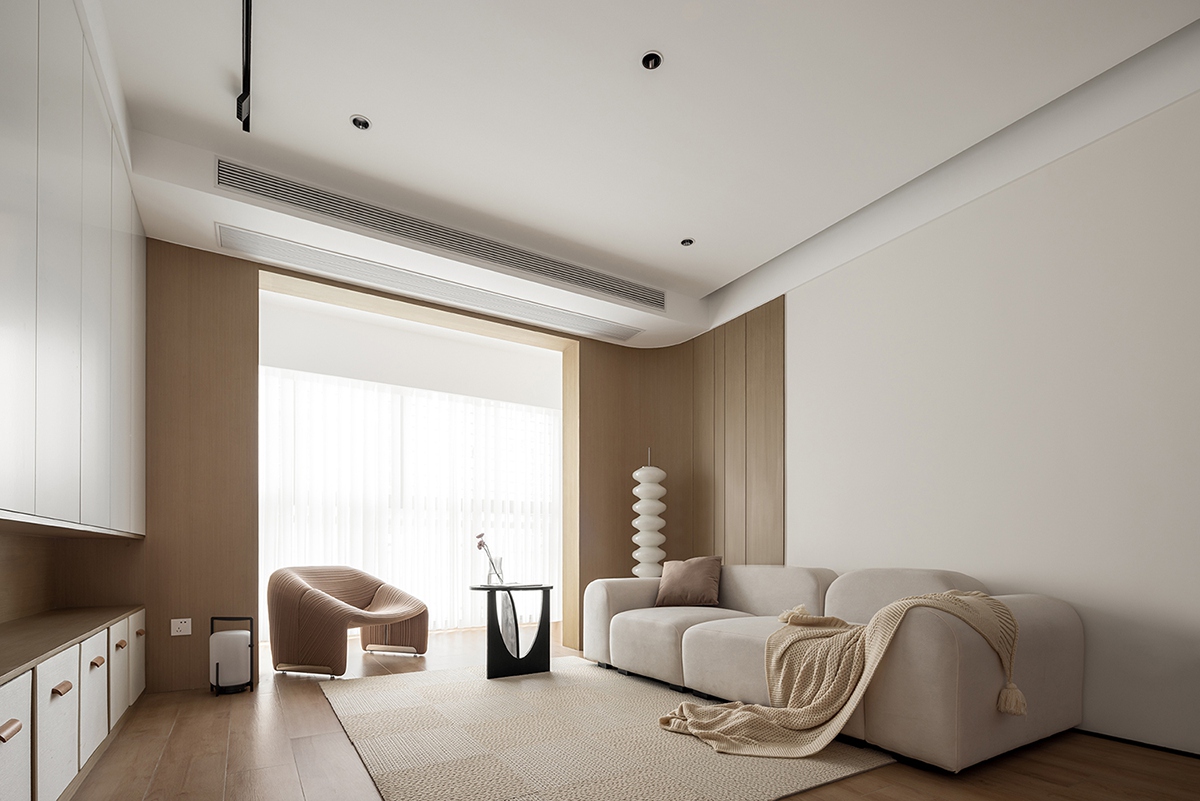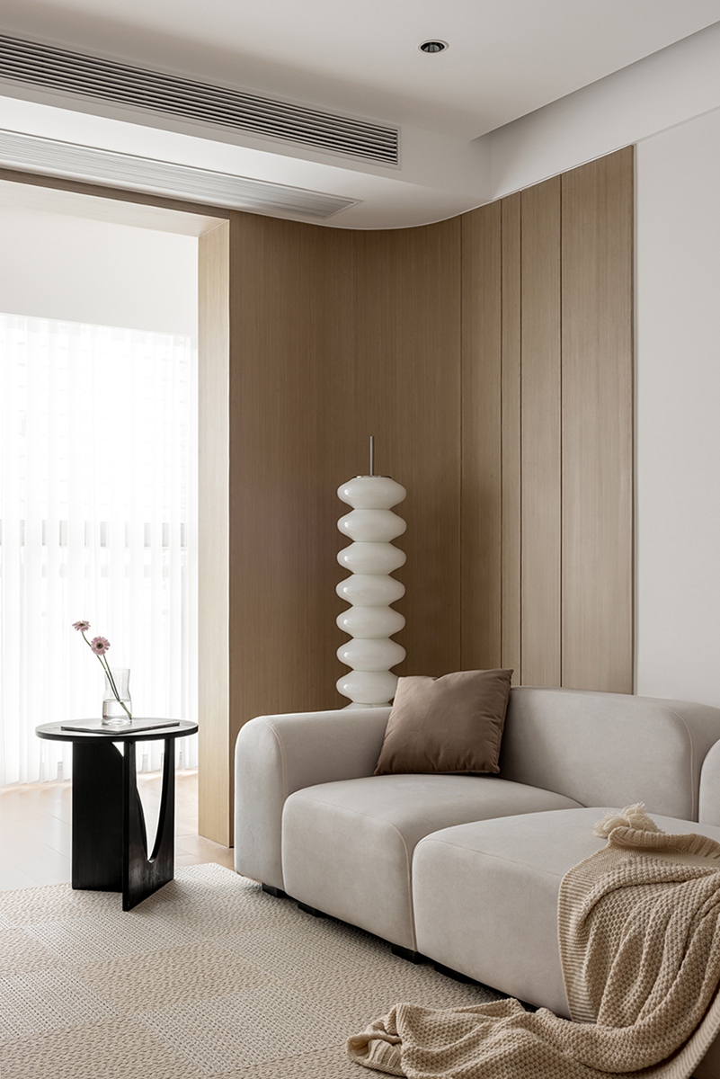 木色与白色的材质对话,在沙发、单人椅的柔化轮廓中更显温润。整墙柜体藏起琐碎,只留光线透过纱帘漫入,搭配螺旋灯与编织毯,把“放空”的松弛感刻进日常。