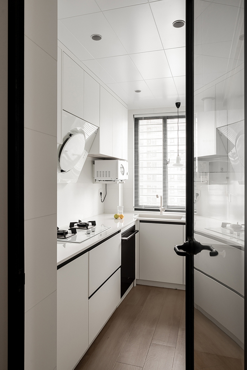 纯白橱柜与黑框玻璃门界定空间,嵌入式家电与流畅动线,让烹饪成为有序又愉悦的仪式;窗台的鲜果点缀,让烟火气也有清新模样。