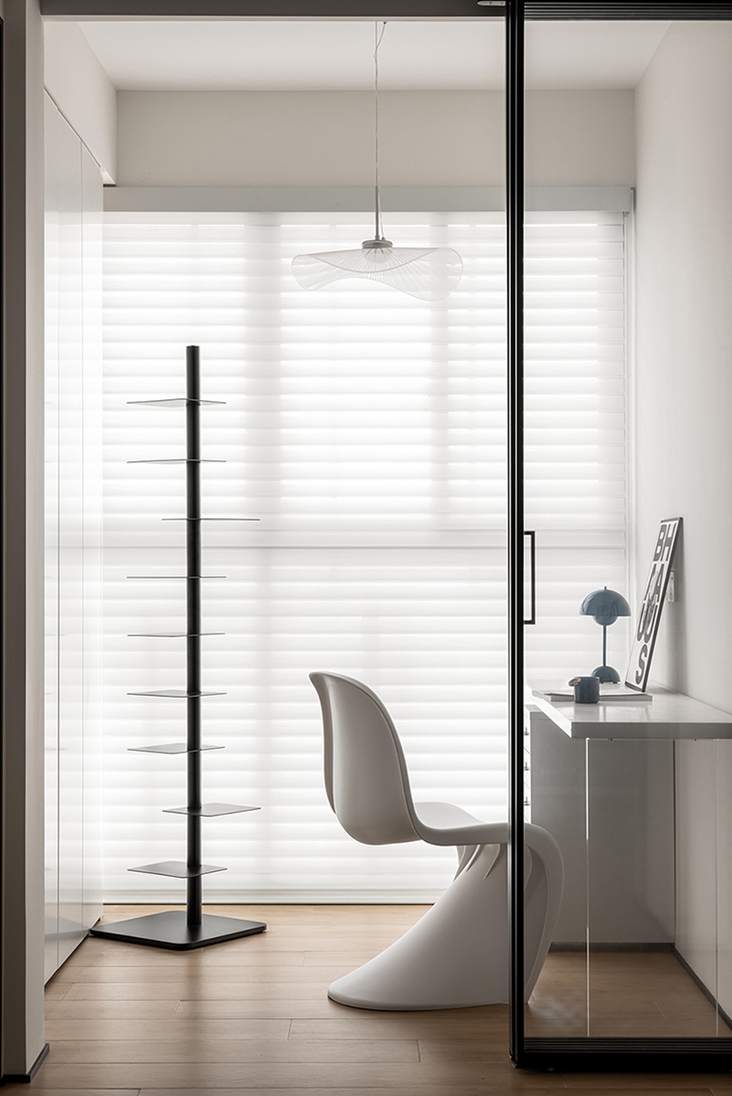 玻璃隔断模糊空间边界,百叶帘滤过的光线轻洒在流线型座椅与极简置物架上,让专注与创意在通透场域里自由生长。