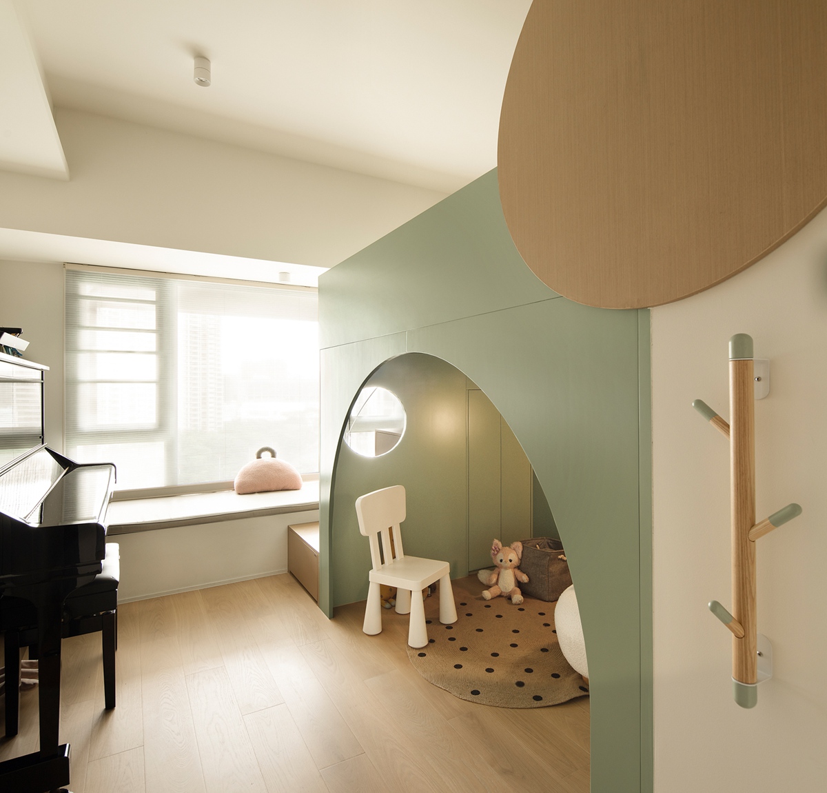 薄荷绿“树屋式” bunk 床是童年的魔法空间,阶梯式收纳与拱形玩耍区,让睡眠、储物、游戏自然融合,柔软玩偶与圆润设计,守护孩子天马行空的成长时光。