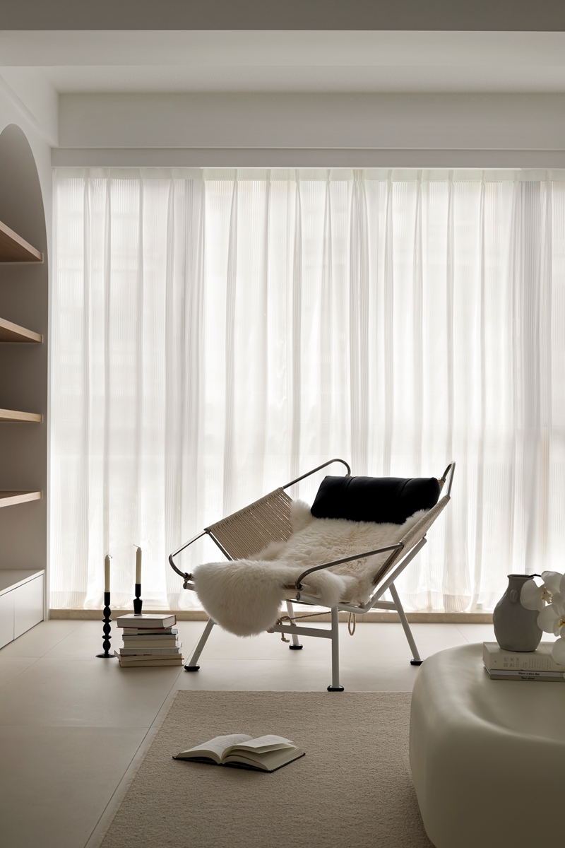 全白基底如一张干净画布,毛绒沙发的柔软弧度、异形茶几的圆润轮廓,消解了极简的冷硬感;拱形置物架隐于光影中,艺术感落地摆件似抽象雕塑,阳光透过薄纱时,整个空间都在“什么都不刻意”的松弛里轻轻呼吸。