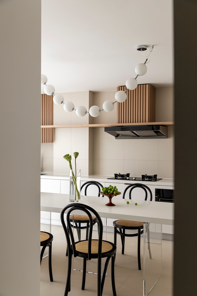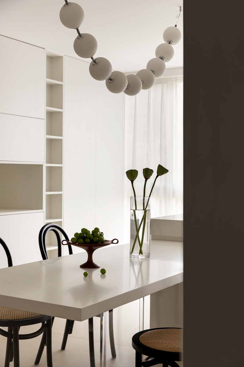 开放式餐厨以白色柜体构建秩序感,木质格栅为空间注入暖调呼吸;球形吊灯如艺术装置悬于餐桌之上,黑框餐椅的复古线条与通透台面碰撞,让下厨、用餐的每一刻,都在理性设计里生长出生活温度。