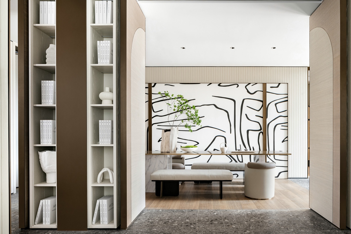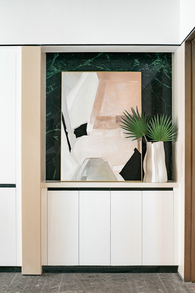 黑白抽象线条如墨色在宣纸上的肆意游走,为空间注入艺术灵魂。大理石茶台的冷冽质感,与绒面长凳的温柔触感形成反差,而青瓷茶器与鲜绿植株的点缀,让极简布局里漾起禅意的涟漪——这里既是品茗静思的角落,也是艺术与生活的过渡场域,每一道线条都在诉说“少即是多”的深刻。