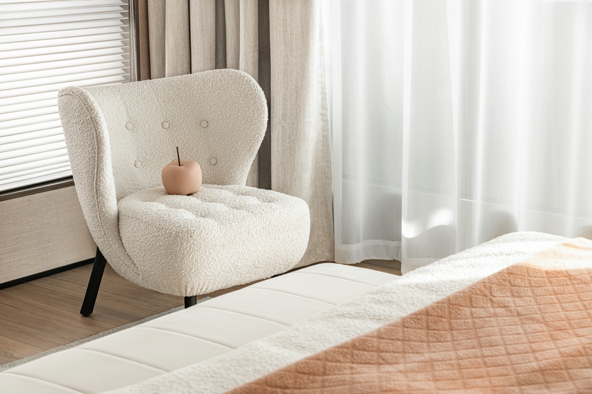 弧形吊顶如被柔化的时光轮廓,将光线温柔地铺陈在空间里。竖纹墙板的秩序感,与墨绿大理石的野性纹理碰撞出戏剧张力;橄榄绿单人椅如艺术雕塑,以大胆色彩打破米白沙发的沉静,而金属底座的玻璃茶几,让奢华感在光影折射中悄然流转——在这里,每一次落座都是与“优雅棱角”的亲密对话。