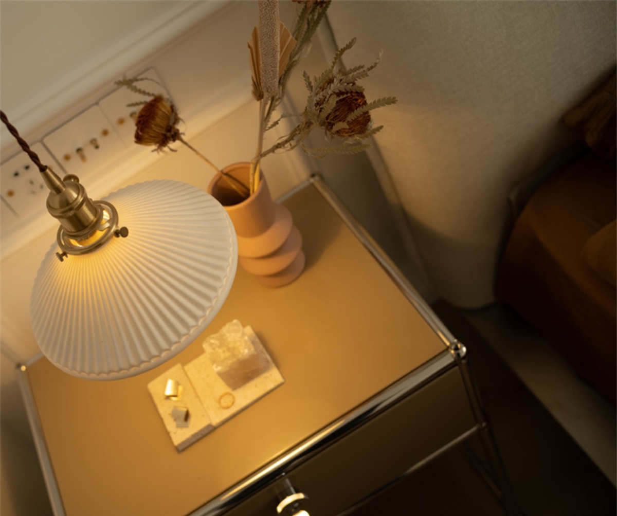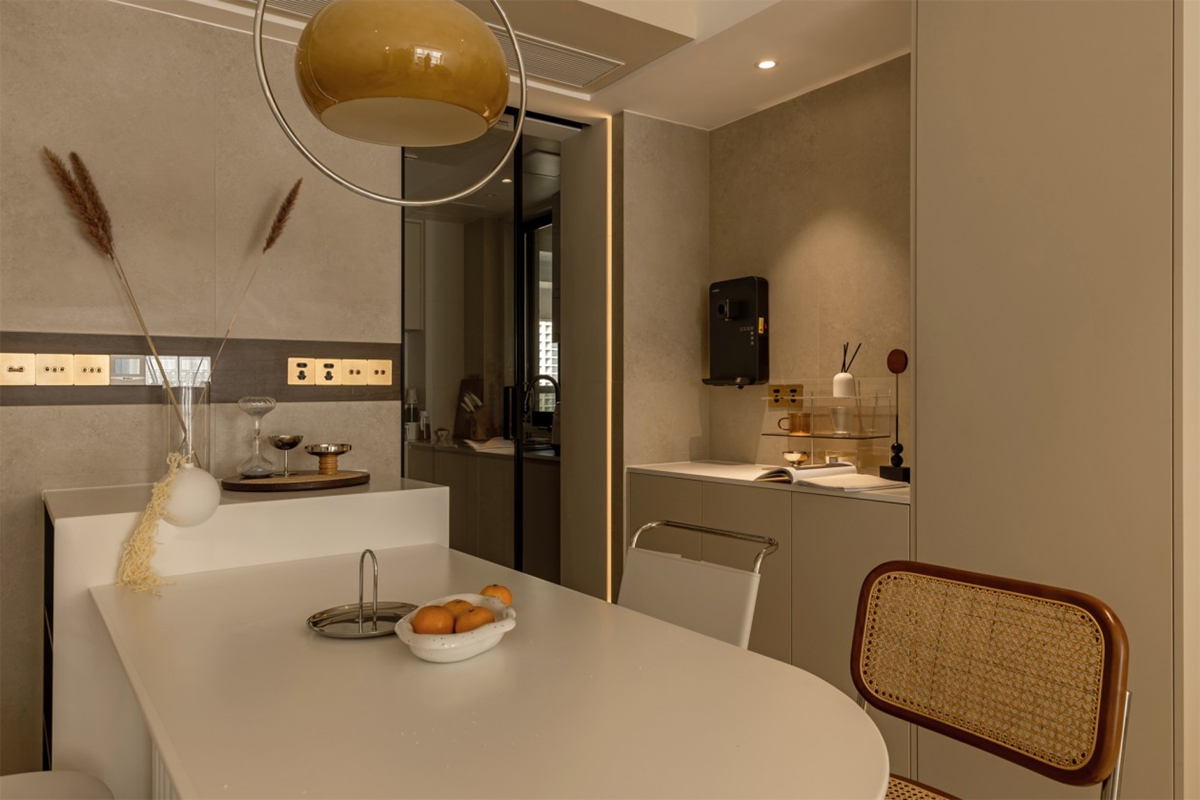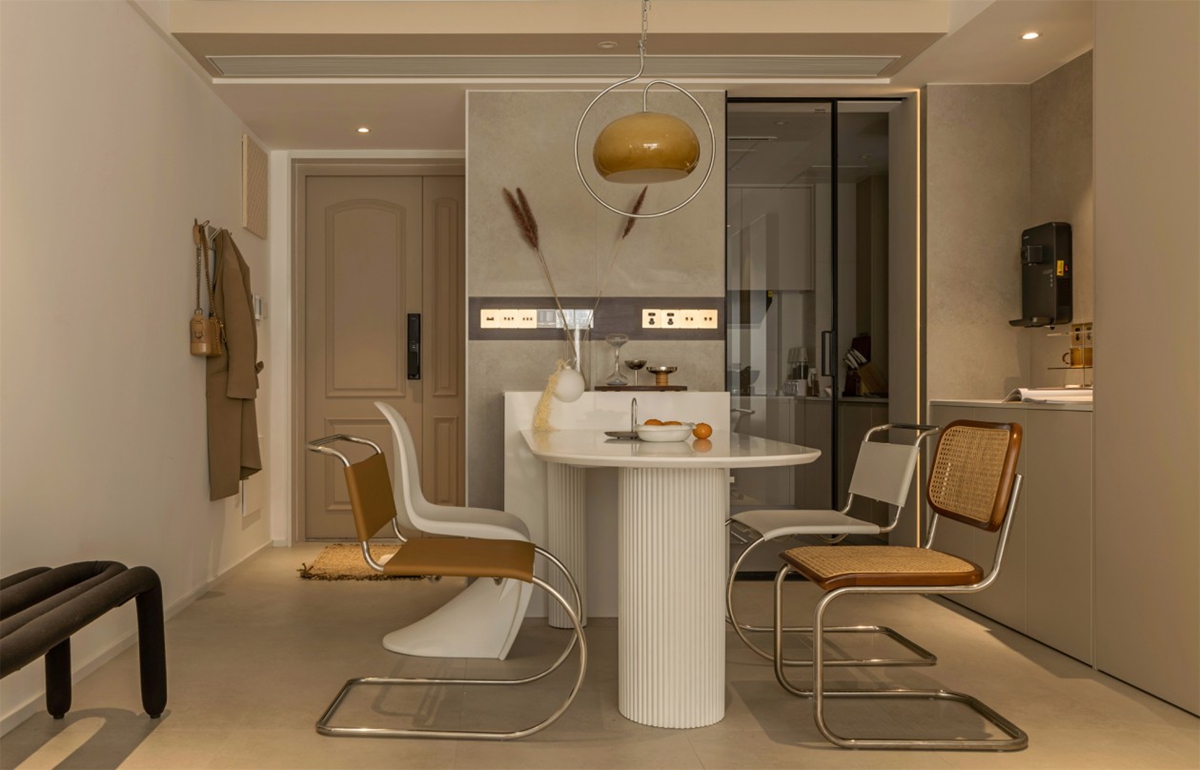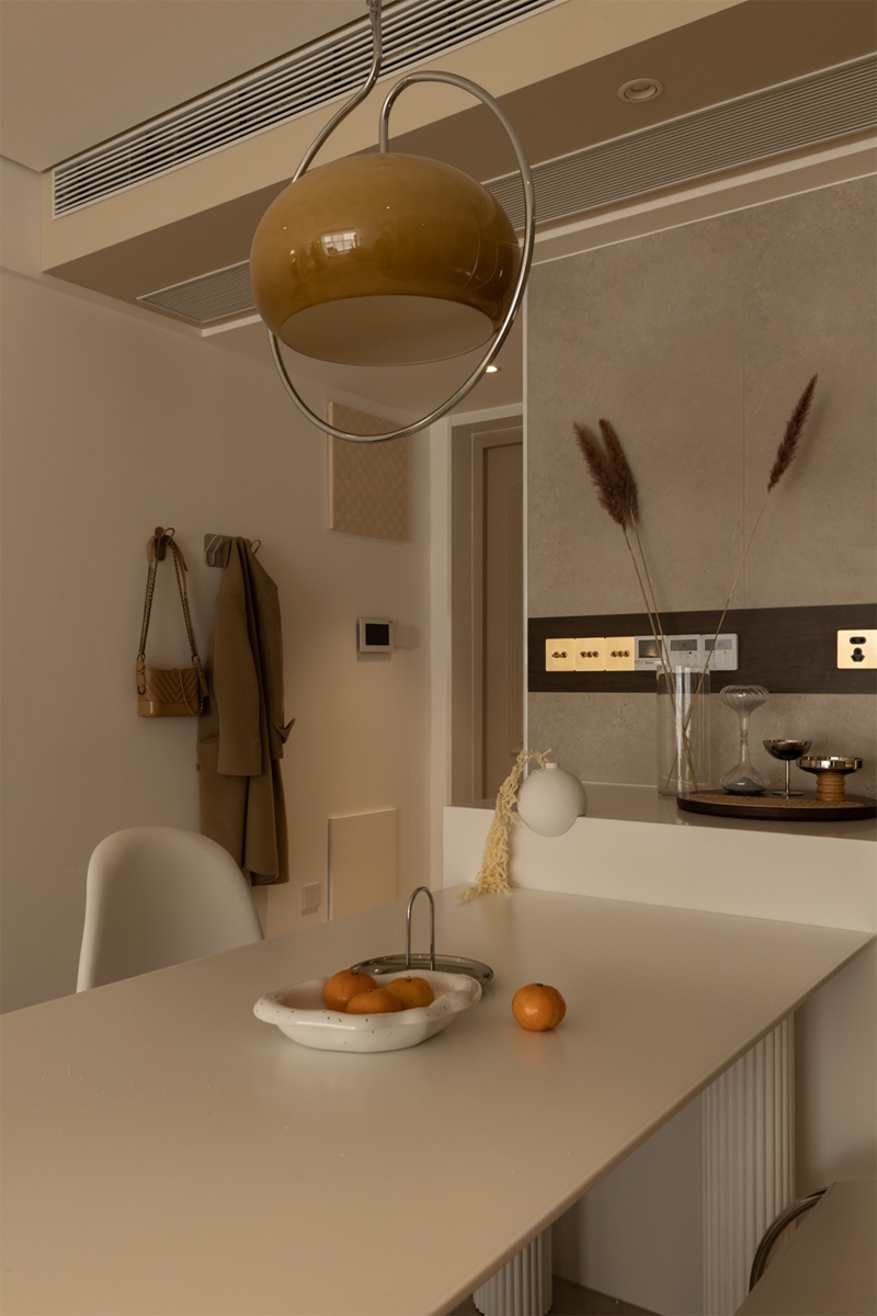 琥珀色吊灯如凝固的蜂蜜,在圆形餐桌上方晕染出暖调光晕;金属椅腿的冷冽线条,与藤编椅面的自然纹理碰撞出复古张力。门边悬挂的风衣与皮包,将“家的烟火”与“日常出行”悄然衔接,而台面的柑橘与干花,让餐厨空间既容得下烹饪的烟火,也盛得下晚风里的小酌时光。