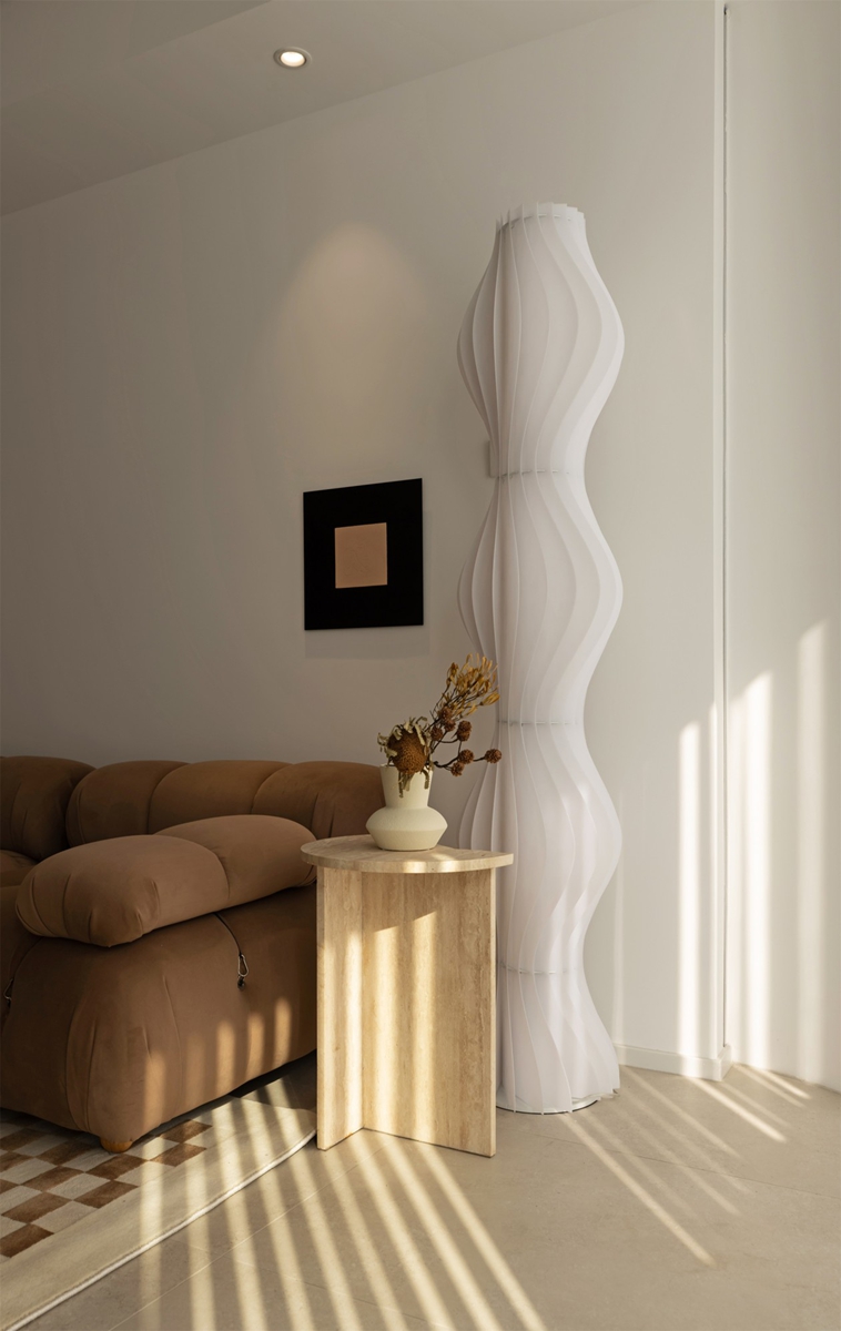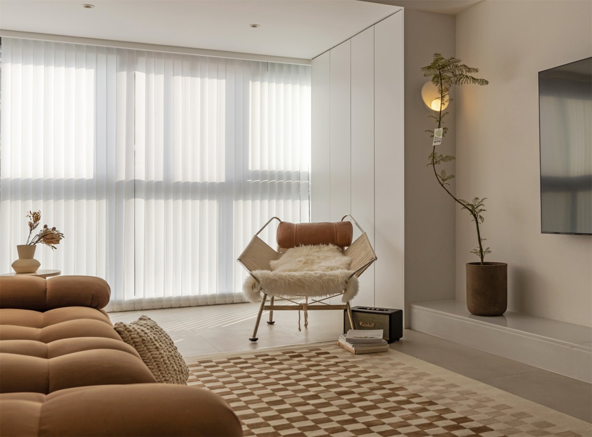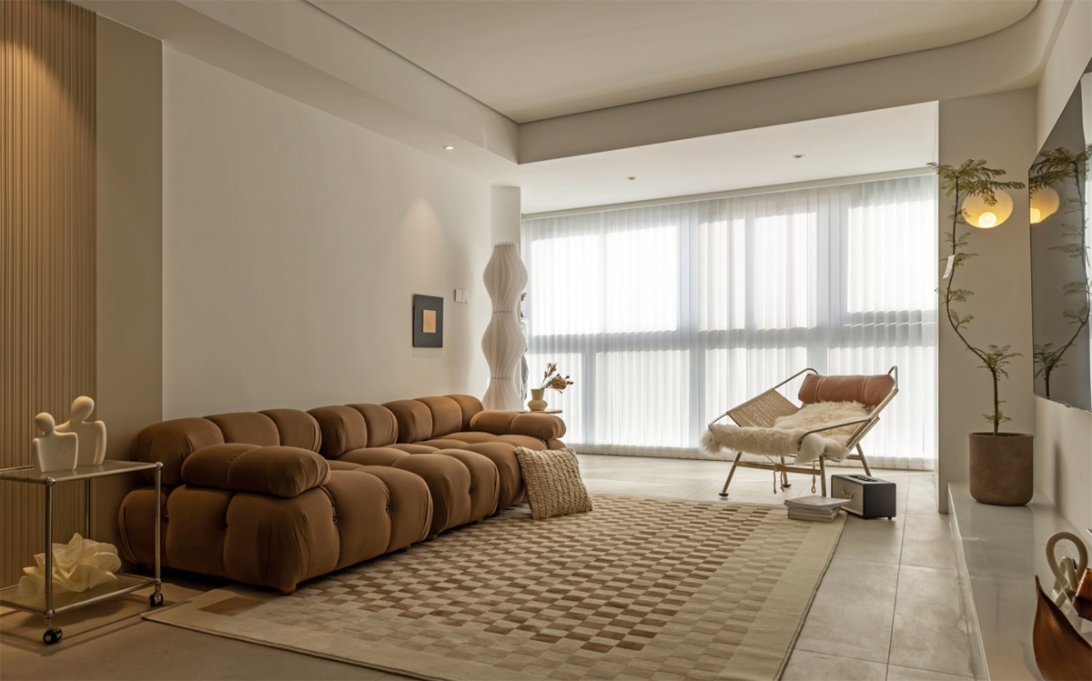 焦糖色模块沙发如被揉软的云朵,将身体温柔包裹;棋盘格地毯的复古纹路,在暖光里漾起岁月的涟漪。褶皱落地灯如抽象雕塑,让极简墙面生长出艺术呼吸感,而针织抱枕的粗粝触感,与沙发绒面形成温柔对话——在这里,每一寸肌理都在低语:“把匆忙日子,坐成慢慢的诗。”