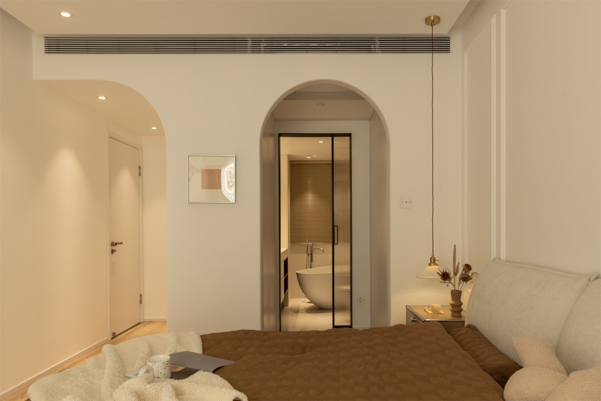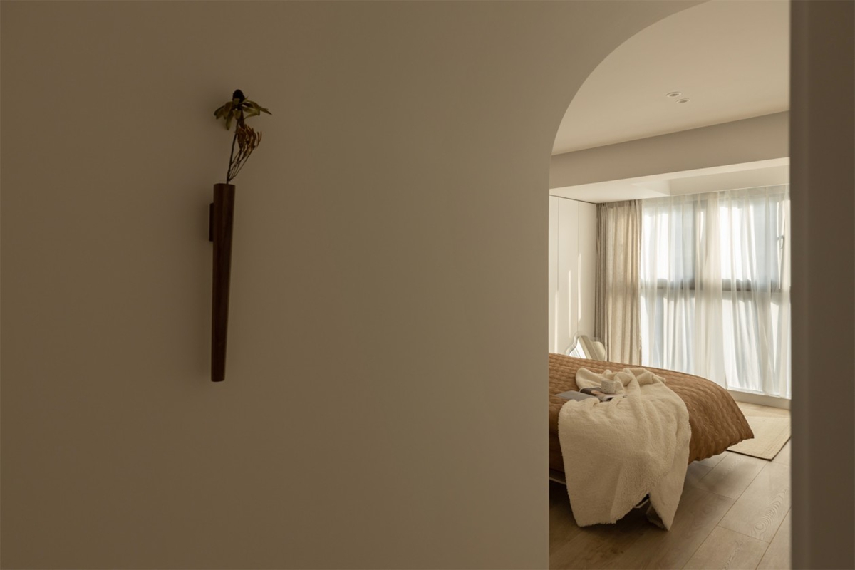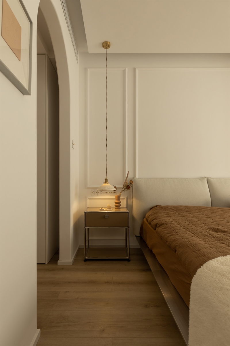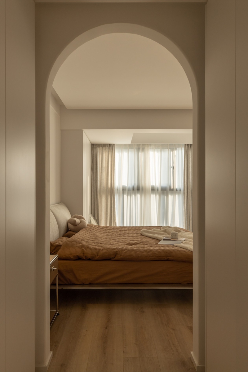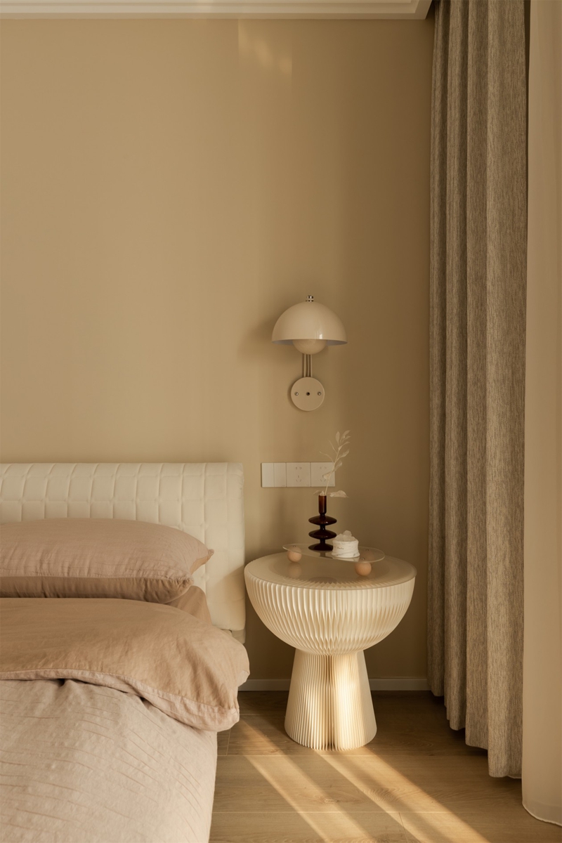 奶咖色墙面如被阳光烘暖的羊绒,包裹住整个睡眠空间。绗缝床头的细腻纹路,与亚麻床品的质朴肌理相映成趣;壁灯的柔光漫过窗帘的绒面质感,将室外光线滤成温柔的纱——当身体陷入床榻,暖棕调的每一处细节都在说:“晚安,把疲惫交给这盏光,醒来时,阳光会替我吻你。”