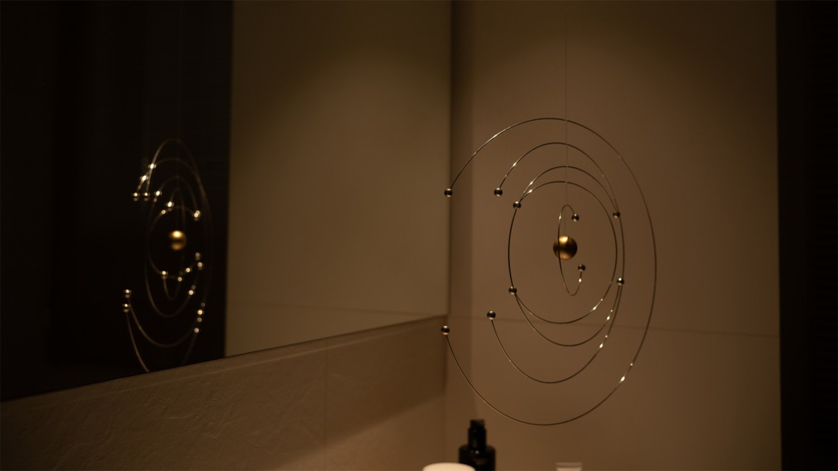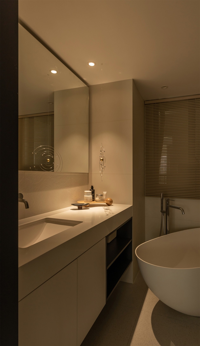 独立浴缸如一块被月光打磨的白玉,静候水与香氛的拥抱;木质小几托着香薰与烛火,让沐浴时刻成为一场私人疗愈仪式。墙面的艺术摆件与扭曲时钟,将“时间感”悄然解构——在这里,水流声是最好的背景音,每一次泡澡都是与自己的深度约会。