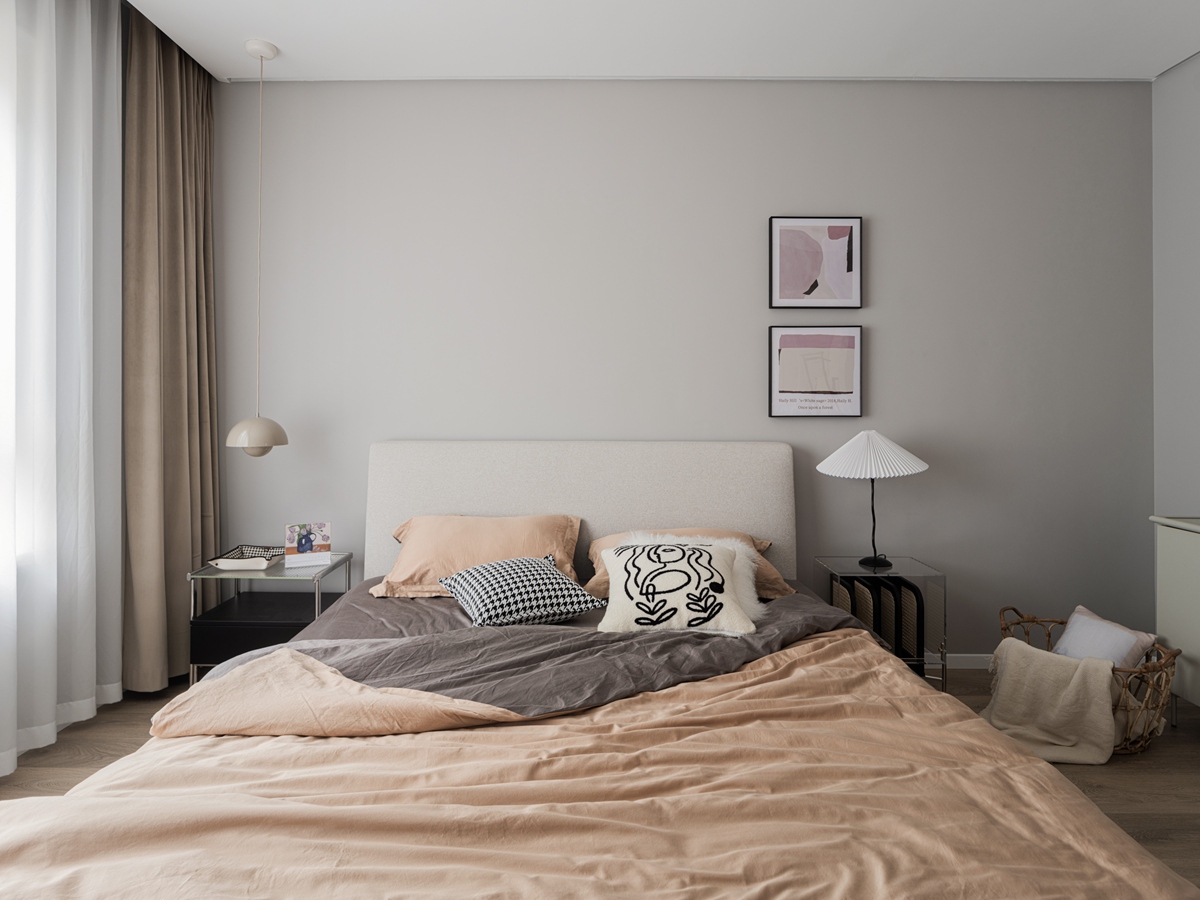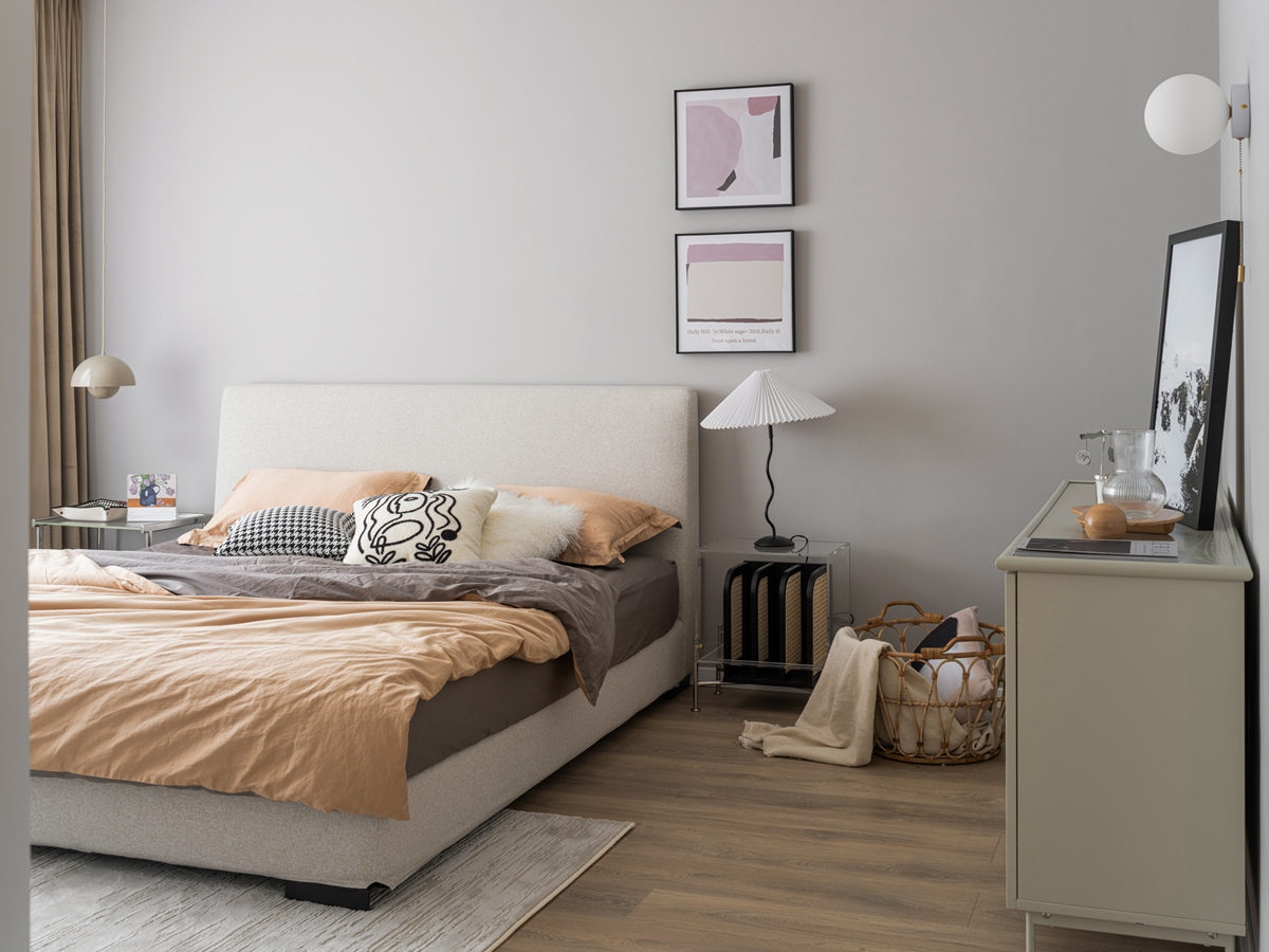 莫兰迪灰墙沉淀白日的疲惫,暖棕床品裹住深夜的松弛。透明边几、褶皱台灯的精致细节,与藤编篮的自然肌理共生,艺术挂画的抽象线条里,藏着只有大人能读懂的静谧。关上门,便是卸下“父母”身份、回归自我的疗愈场域。