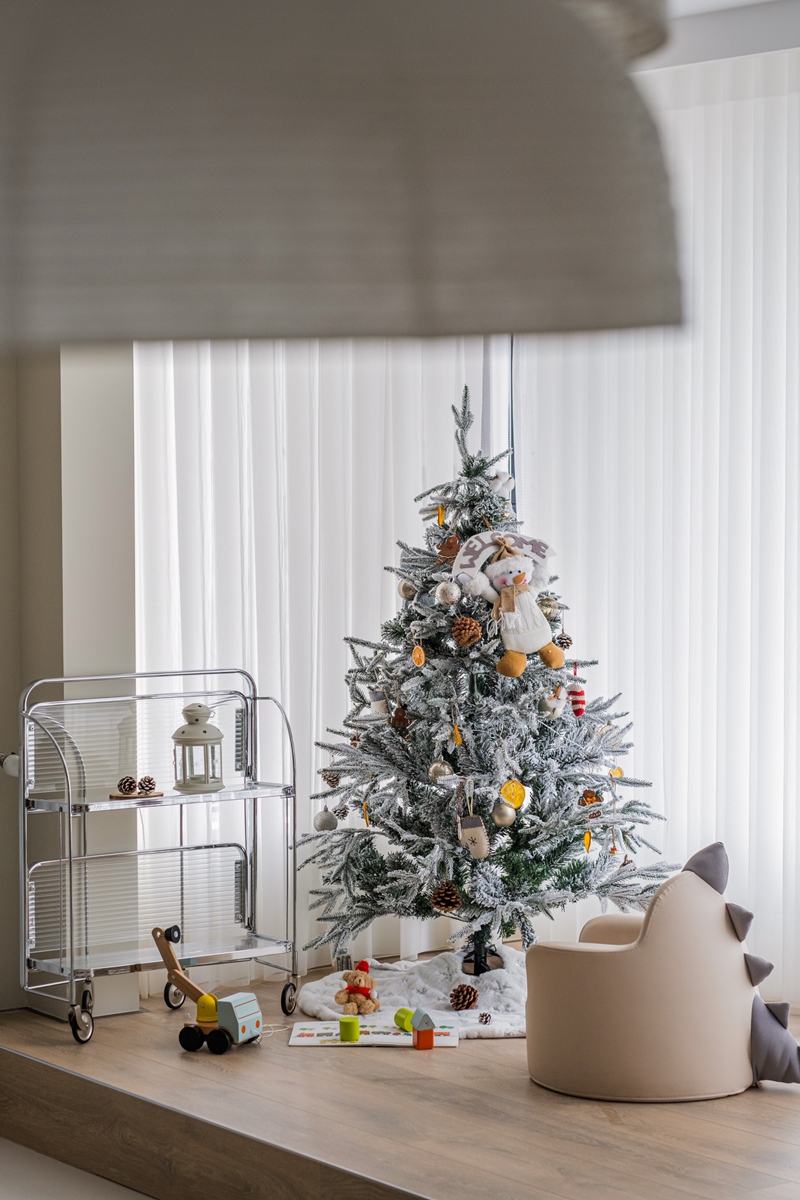 极简岛台既是大人备餐的操作台,也是孩子涂鸦的小天地。不同材质的餐椅包容全家的坐姿,圣诞树下的玩具车与餐边柜的艺术画相映成趣,将“烹饪的烟火”“节日的仪式”“亲子的陪伴”揉进同一空间,让每一次围坐都成为情感联结的契机。