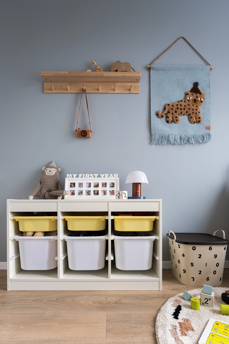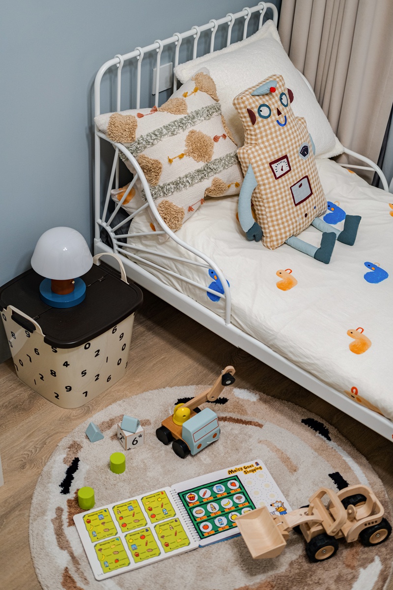 浅蓝色墙面晕染出梦幻底色,白色铁艺床支起童年的想象框架。机器人玩偶、卡通床品是孩子的玩伴,数字收纳箱悄悄培养秩序感,木质玩具与认知绘本铺就探索世界的第一步——这个空间没有多余装饰,却把“安全感”与“好奇心”装得满满当当。