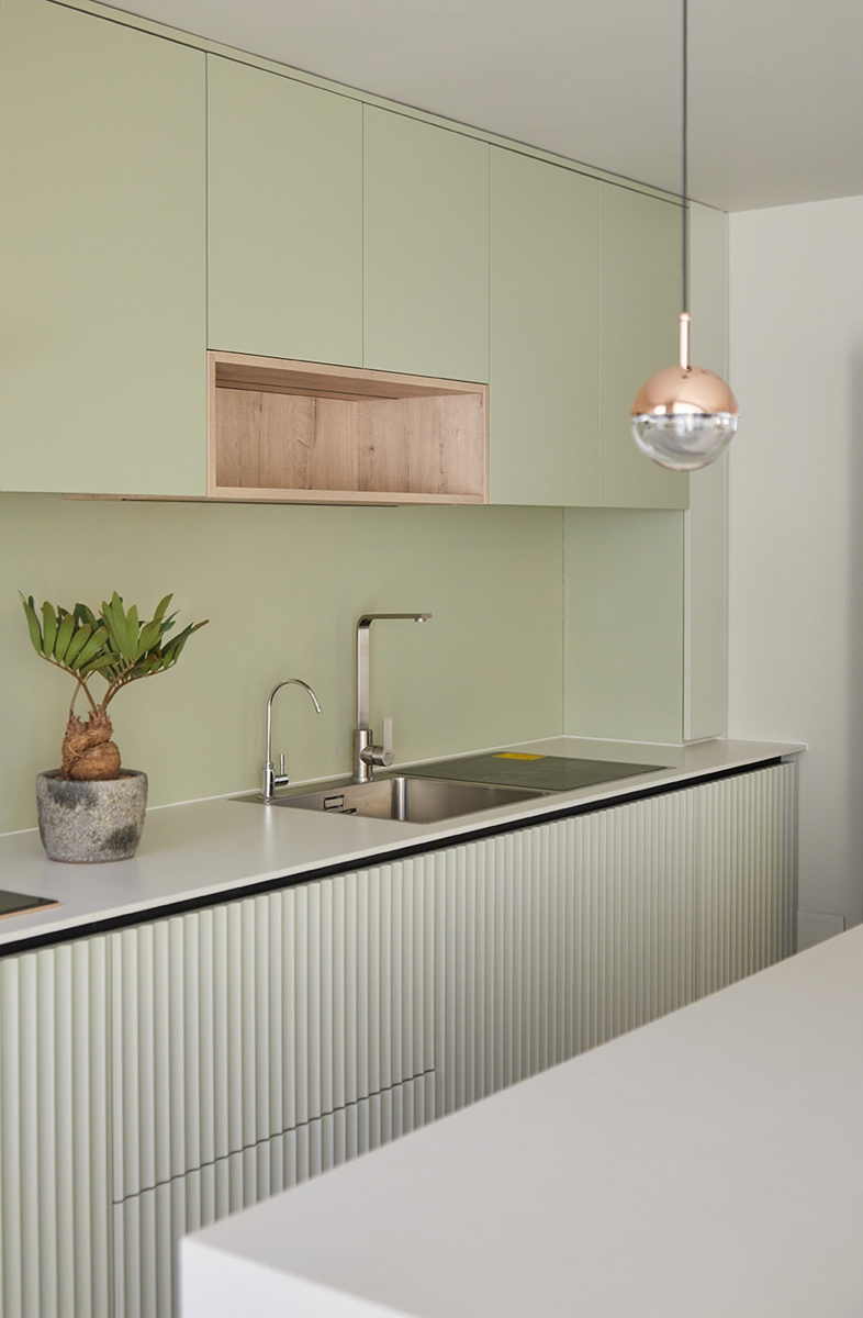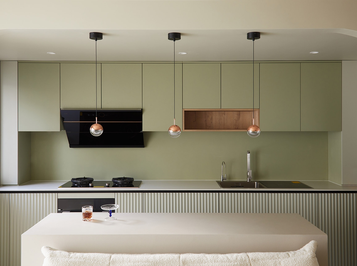 橄榄绿橱柜晕染出自然底色,铜色球形吊灯如露珠般点亮餐厨空间,木质嵌格透出温暖肌理。波纹柜门暗藏收纳智慧,岛台既是备餐的操作台,也是亲友小聚时的“社交中心”;杯盏置于台面上,让烹饪的烟火气与草木的清新感共生,每一次开火都成了生活的抒情诗。