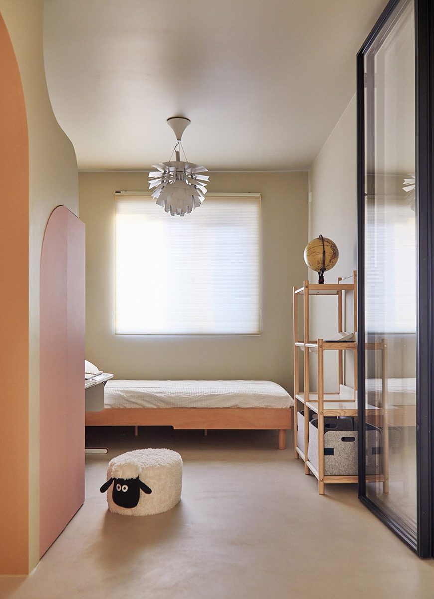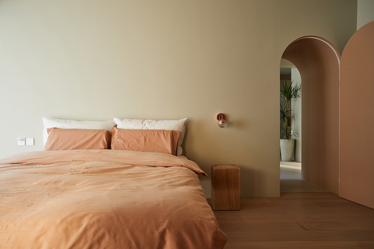 奶杏色墙面晕染出温柔基底,暖棕床品裹住深夜的松弛。原木小边几、弧面壁灯的细节里,藏着自然材质的温度;拱形门洞如时光的通道,将室外绿意悄悄引入,关上门,便是卸下疲惫、回归自我的疗愈场域——没有多余装饰,却用色彩与形态的温柔,把“睡眠的安稳”“独处的自在”都揉进每一寸空间。