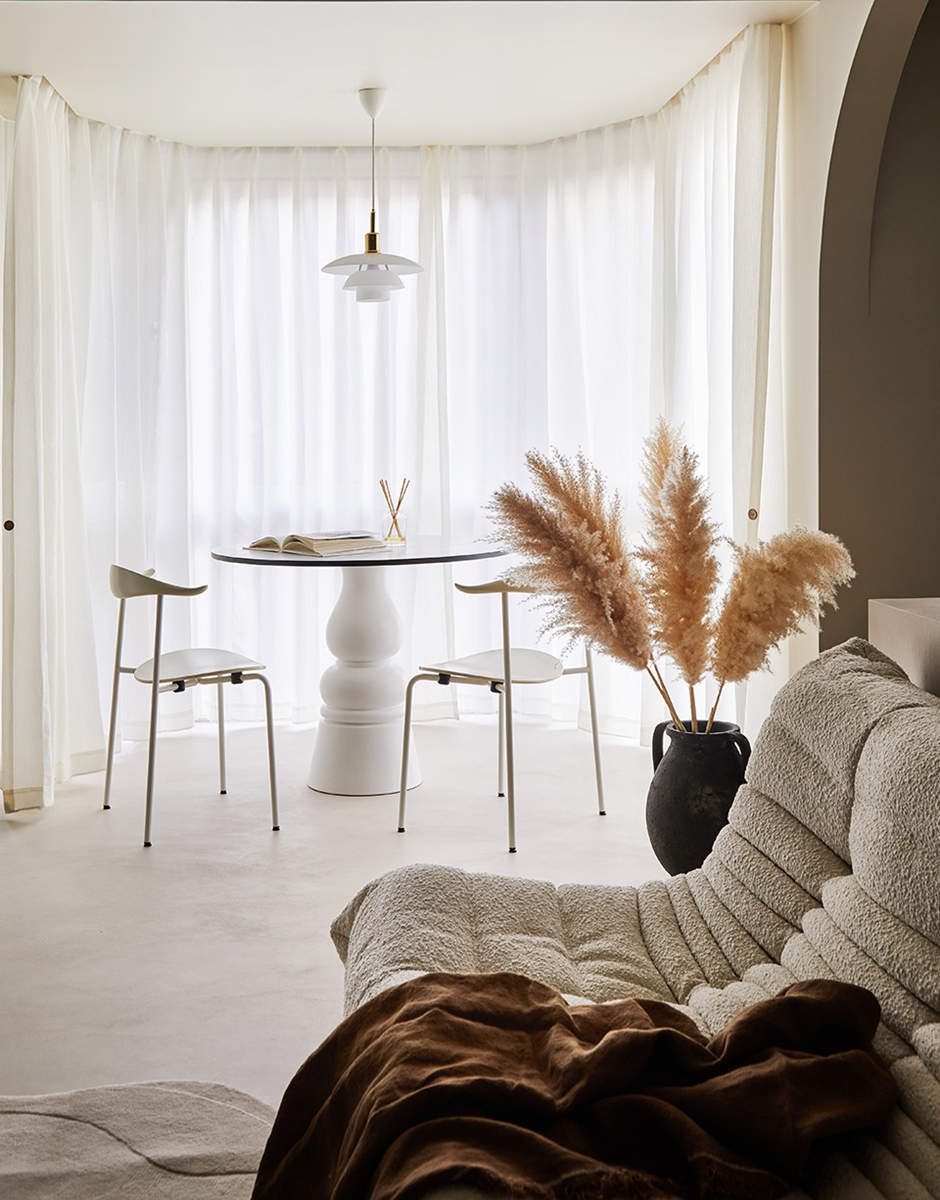 弧形落地窗被白纱滤成朦胧光晕,复古吊灯如艺术雕塑悬于上方。白色墩形餐桌与极简餐椅的组合,消解了“正式感”的束缚;黑色陶罐里的蒲苇随光影轻晃,毛绒沙发裹着深棕毛毯,把“阅读的静谧”“放空的慵懒”都妥帖收纳——在这里,时间会不自觉慢下来,与空间一起陷入松弛的漩涡。