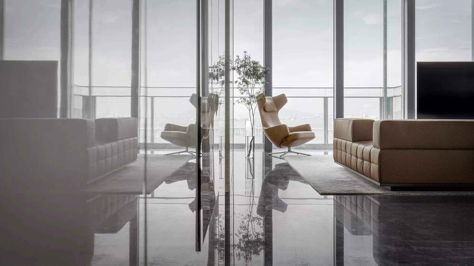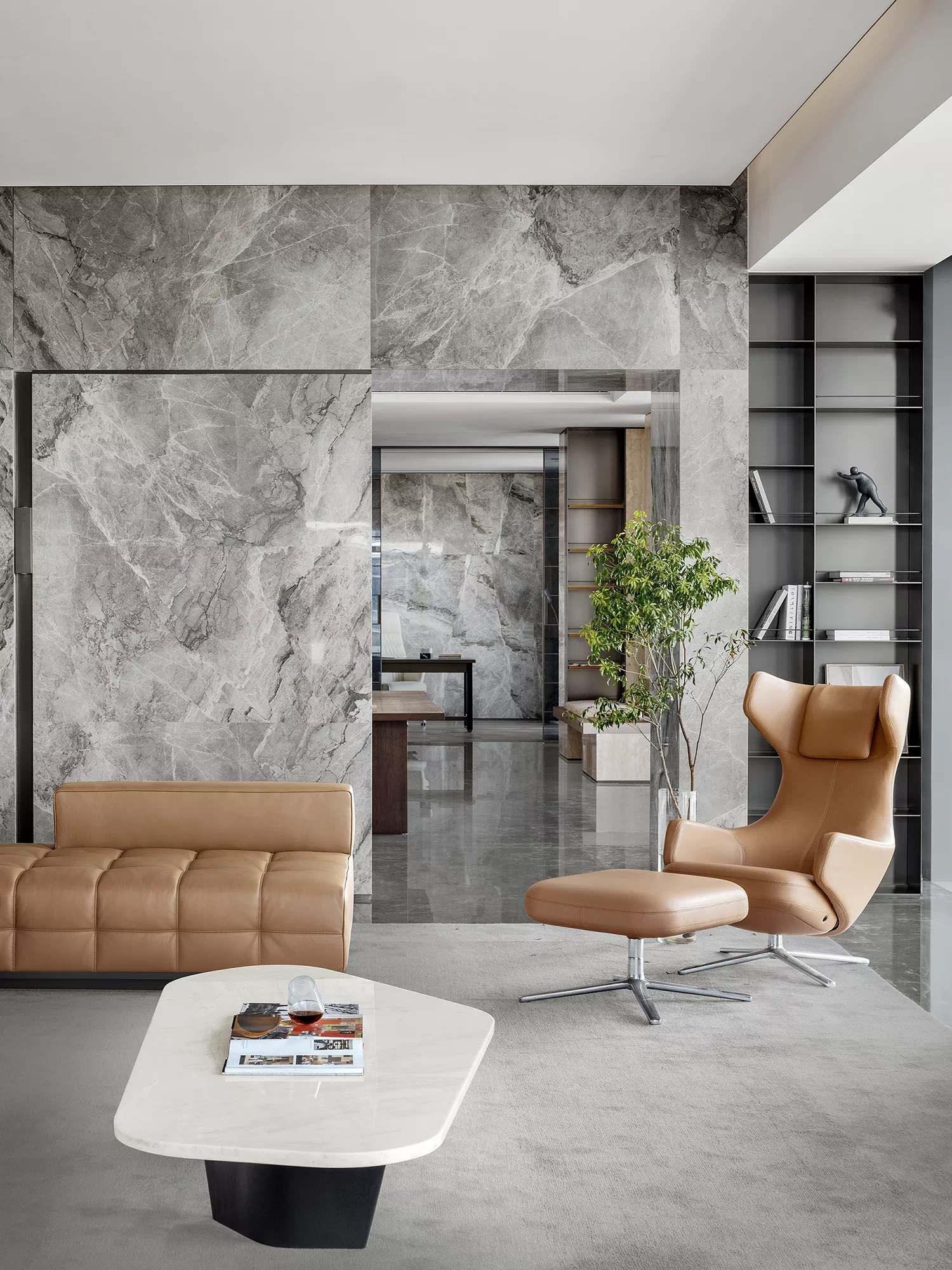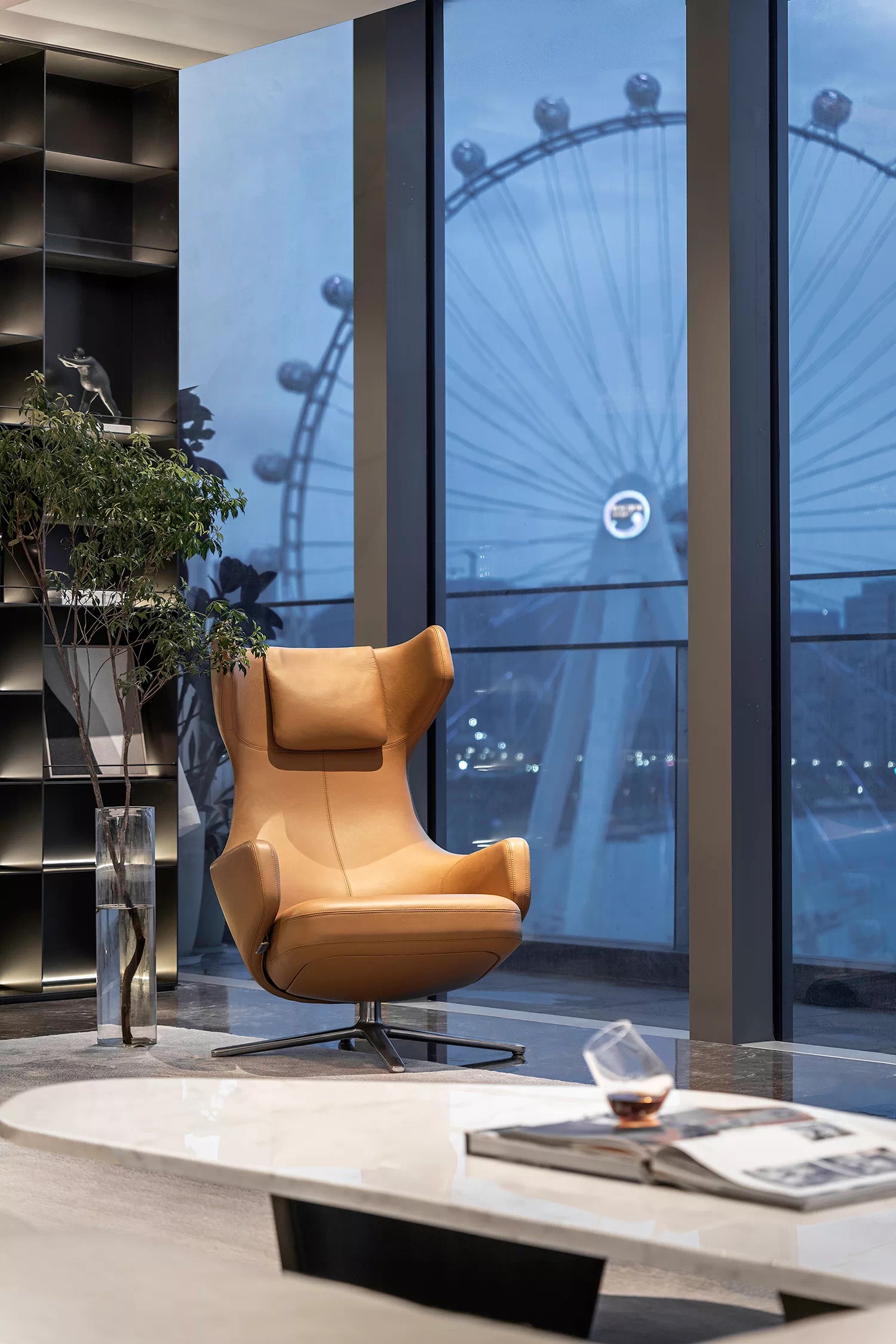 大面积无框玻璃将江景与摩天轮纳入室内,成为天然的艺术背景。浅灰石材墙面的冷调质感,与米白沙发、焦糖色单椅的暖调肌理碰撞,在金属格栅隔断的现代语汇中,让空间既通透又充满层次,成就社交与休憩的双重场域。