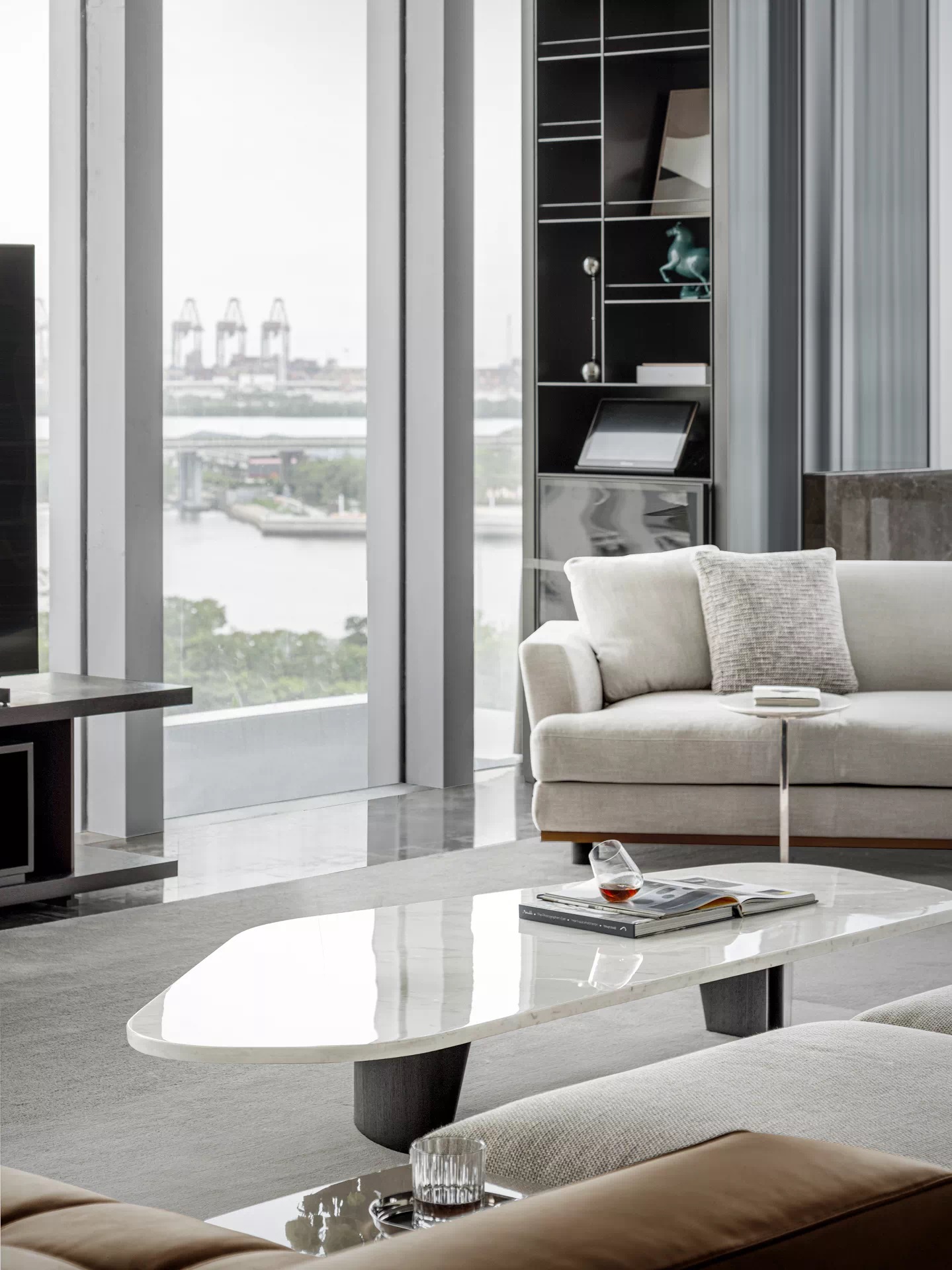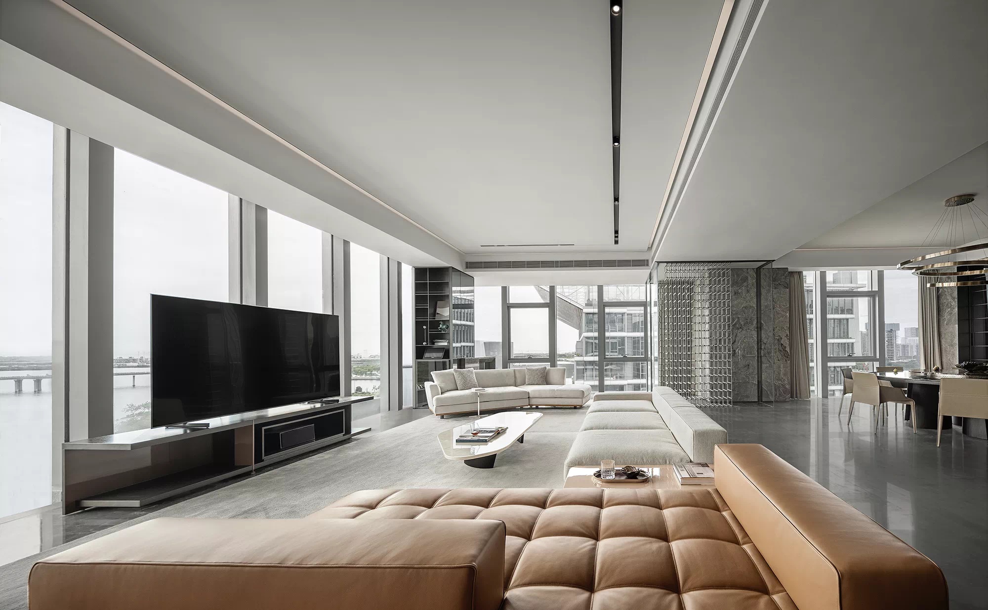 以「理性极简」为内核,这套设计将都市的摩登气息与生活的松弛感深度糅合。从客厅到卫浴,每一处场景都在「克制与释放」的平衡中,演绎着当代精英对居所的极致想象——既要有俯瞰城市地标(如窗外摩天轮)的视野野心,又要容纳独处时的静谧温度。