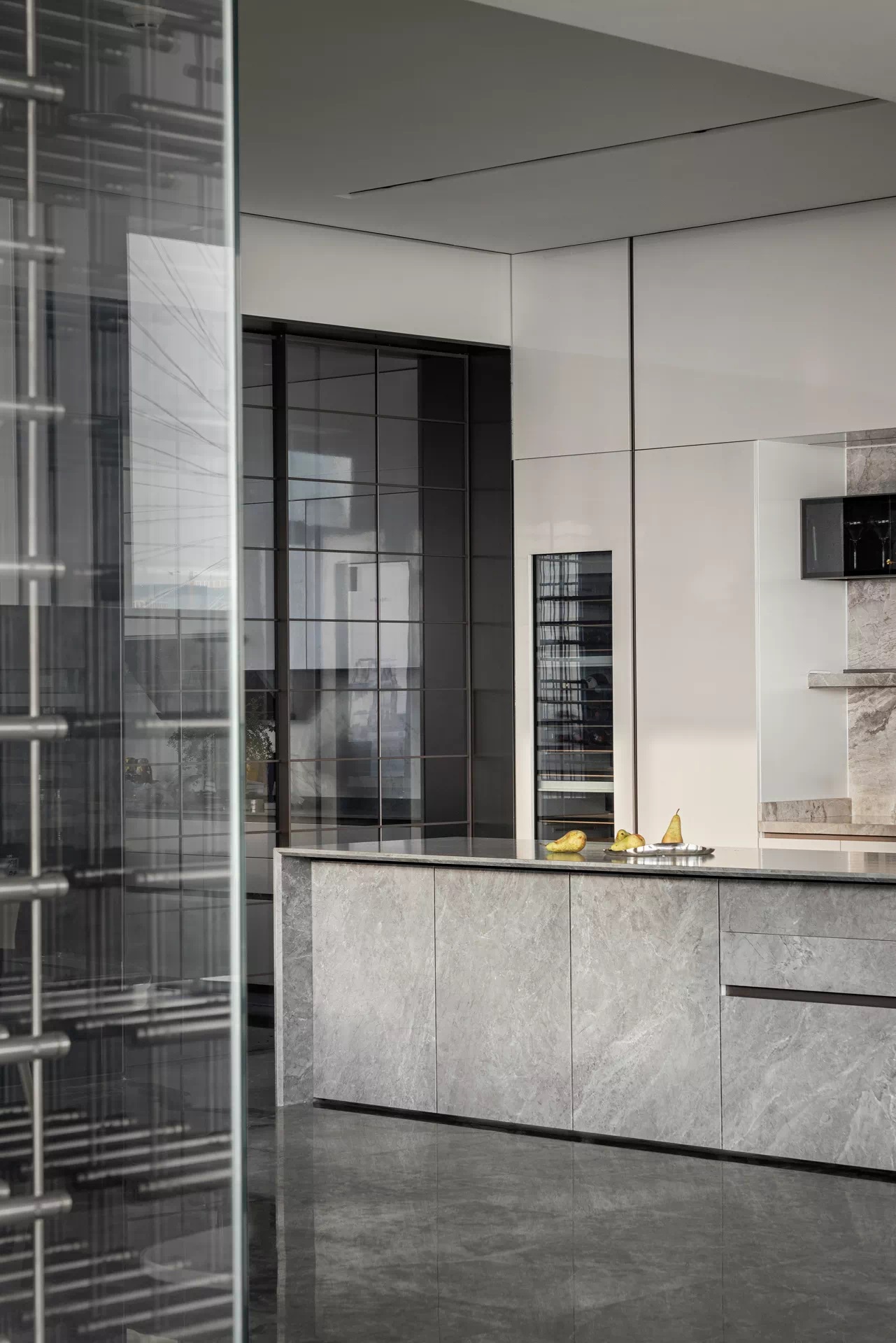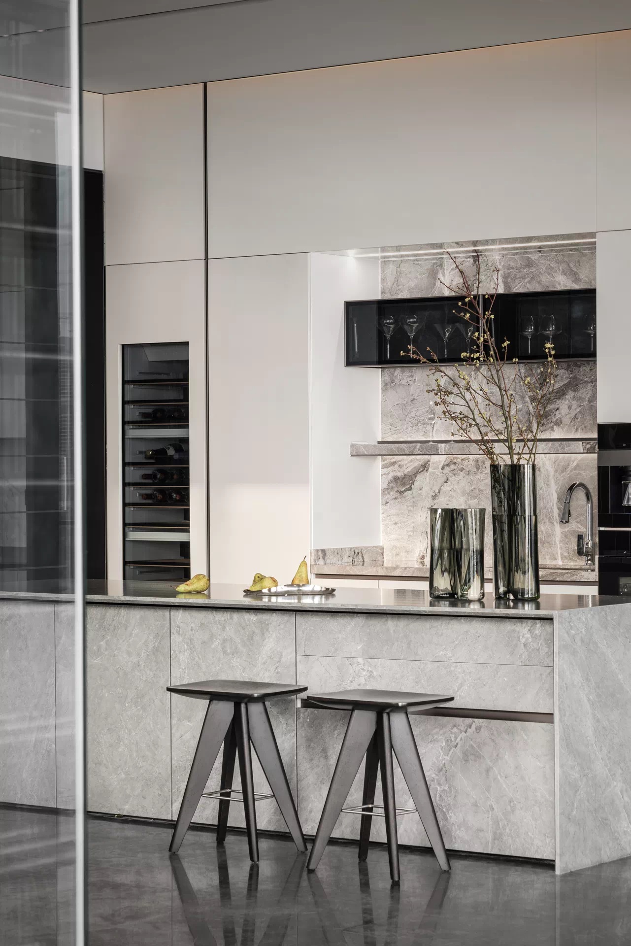 灰白大理石岛台消解了厨房的烟火厚重感,嵌入式酒柜与玻璃置物架的设计,让收纳也成为视觉美学的一部分。两把几何感吧椅的点缀,让备餐区秒变轻松的社交角落,将「实用」与「审美」不着痕迹地融为一体。