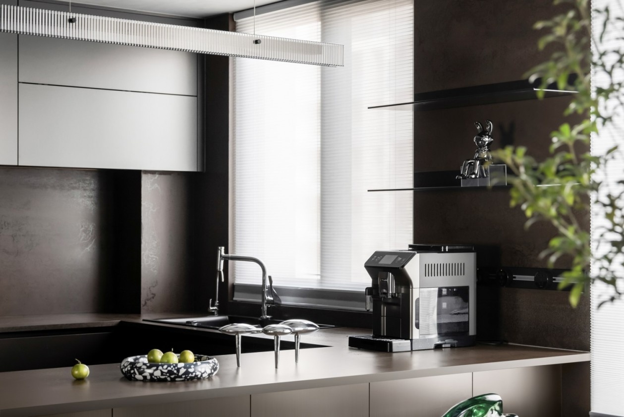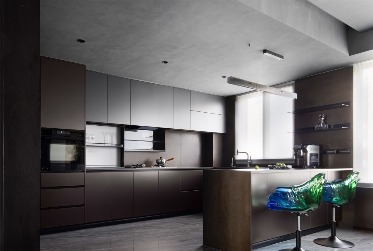 高级灰与深棕的橱柜配色,是冷静与温暖的绝妙平衡。一体化的厨电设计将功能隐于美学之下,岛台旁的艺术感吧台椅如琉璃雕塑,为烟火气的厨房注入艺术灵韵。在这里,烹饪不再是单调的家务,而是在先锋设计包裹下的生活创作,每一次下厨都是一场关于“实用美学”的先锋实验。