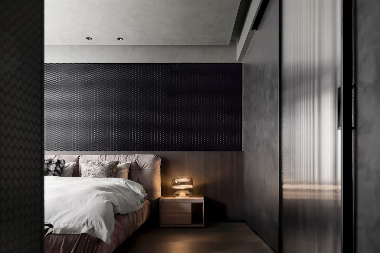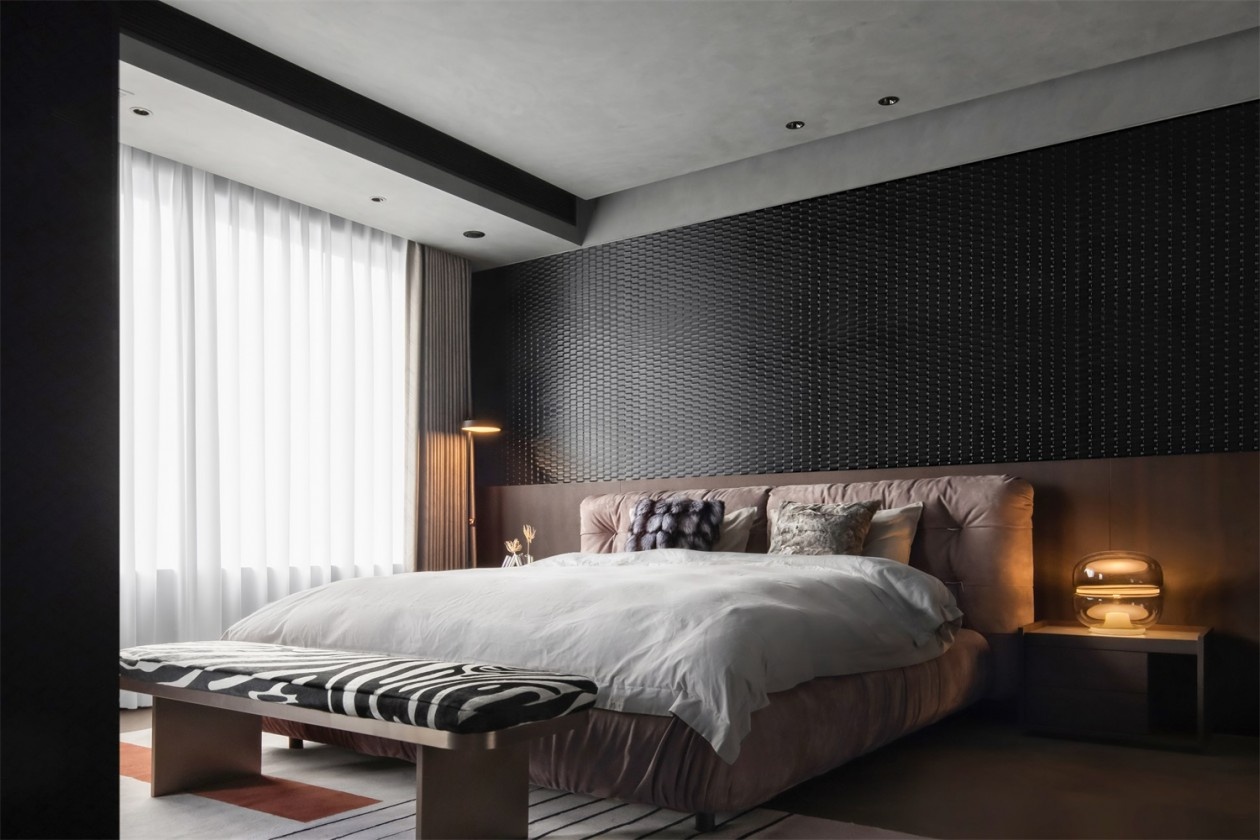 蜂窝状的黑色肌理墙如当代艺术的装置,为卧室烙下强烈的个性印记。豆沙粉的软包床具却在此刻释放出温柔信号,斑马纹床尾凳的野性元素与之碰撞,形成“刚柔并济”的空间情绪。暖光台灯的光晕在暗黑中晕染开,将卧室变为都市人的私密秘境——在极致的视觉张力里,藏着最松弛的休憩角落。