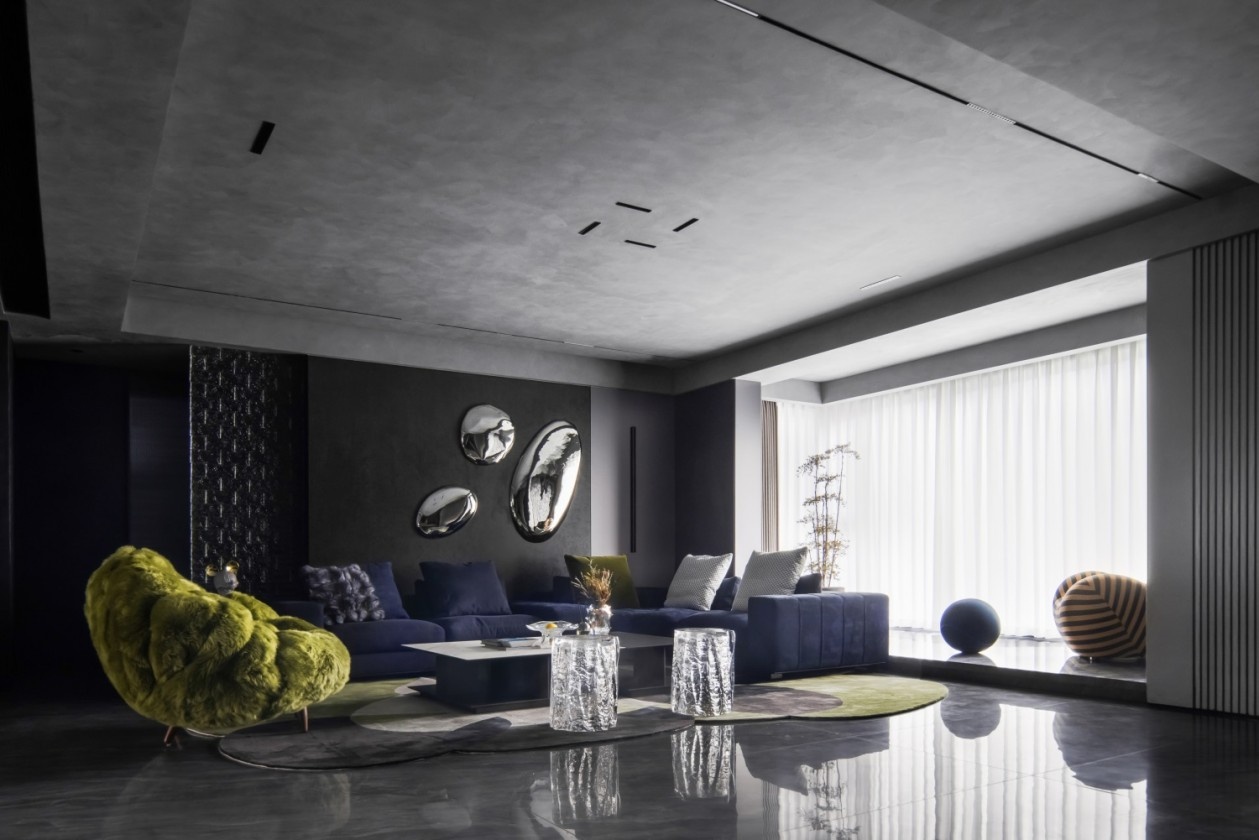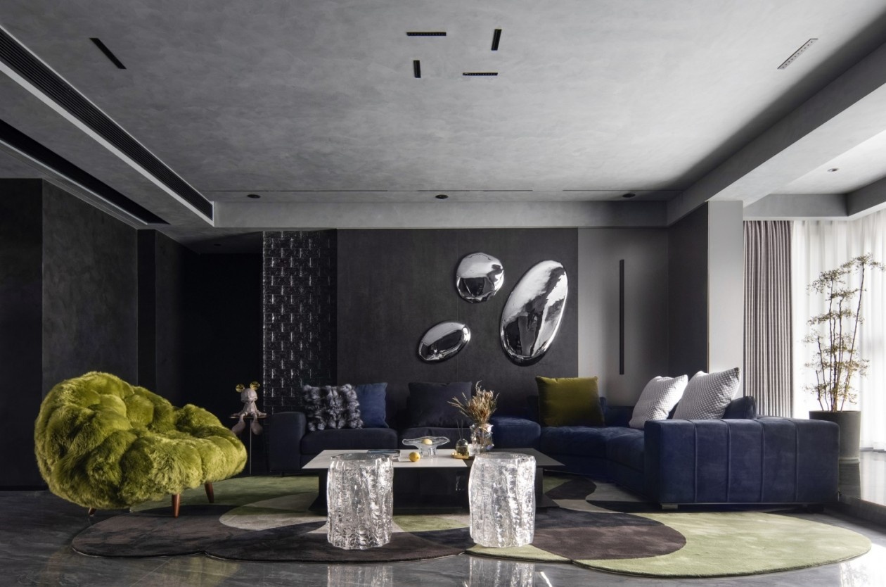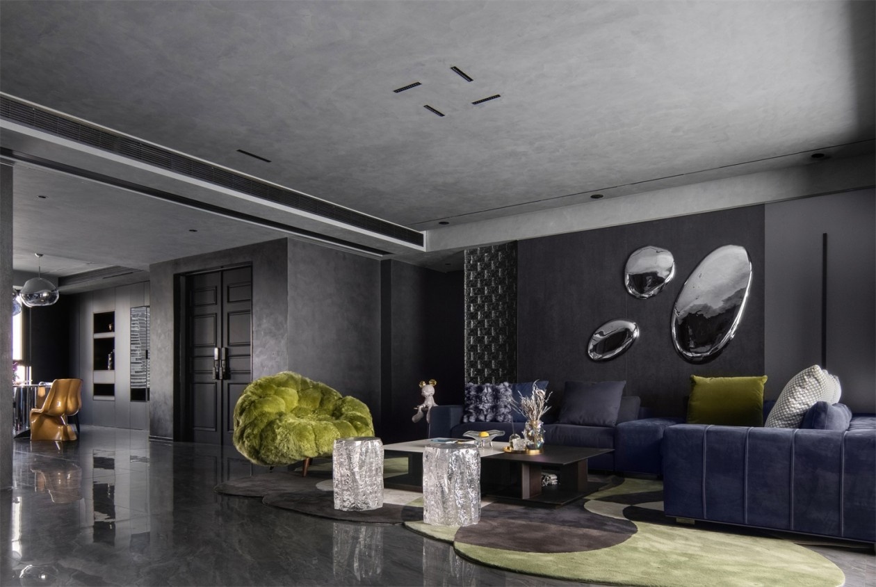 深灰与墨黑构建出沉稳的空间基底,如同高级定制的幕布,衬得那抹荧光绿的艺术感单椅格外夺目,成为视觉焦点的“惊喜炸弹”。绒面深蓝沙发的质感在光影下细腻流转,墙面金属感艺术装置如未来世界的镜面,折射出空间的多维层次。地面的反光石材与异形地毯形成材质对话,让每一次踏入都像走进沉浸式艺术展厅,奢华不再是浮夸的堆砌,而是藏在每一处材质、每一件陈设里的精致暗语。