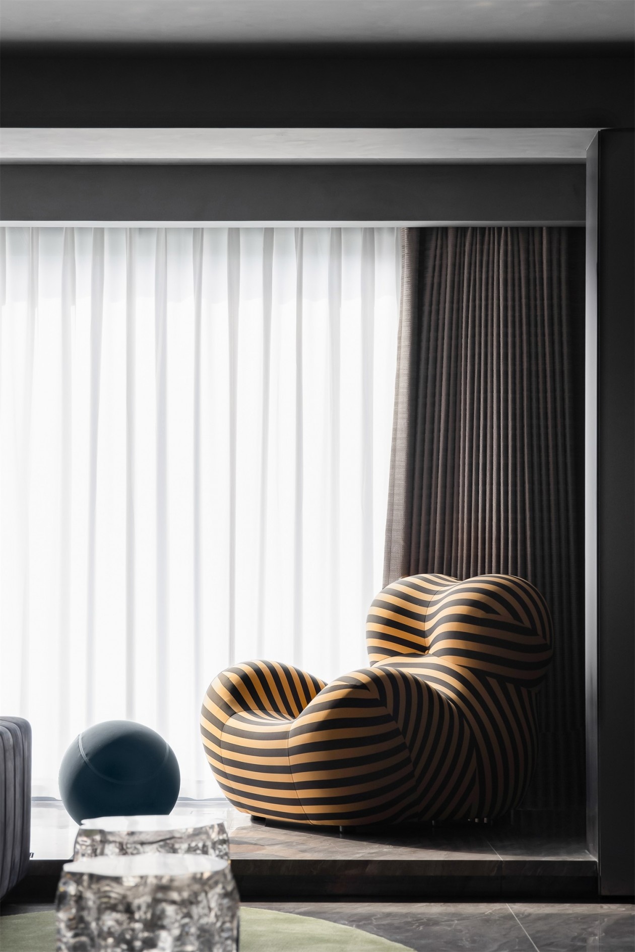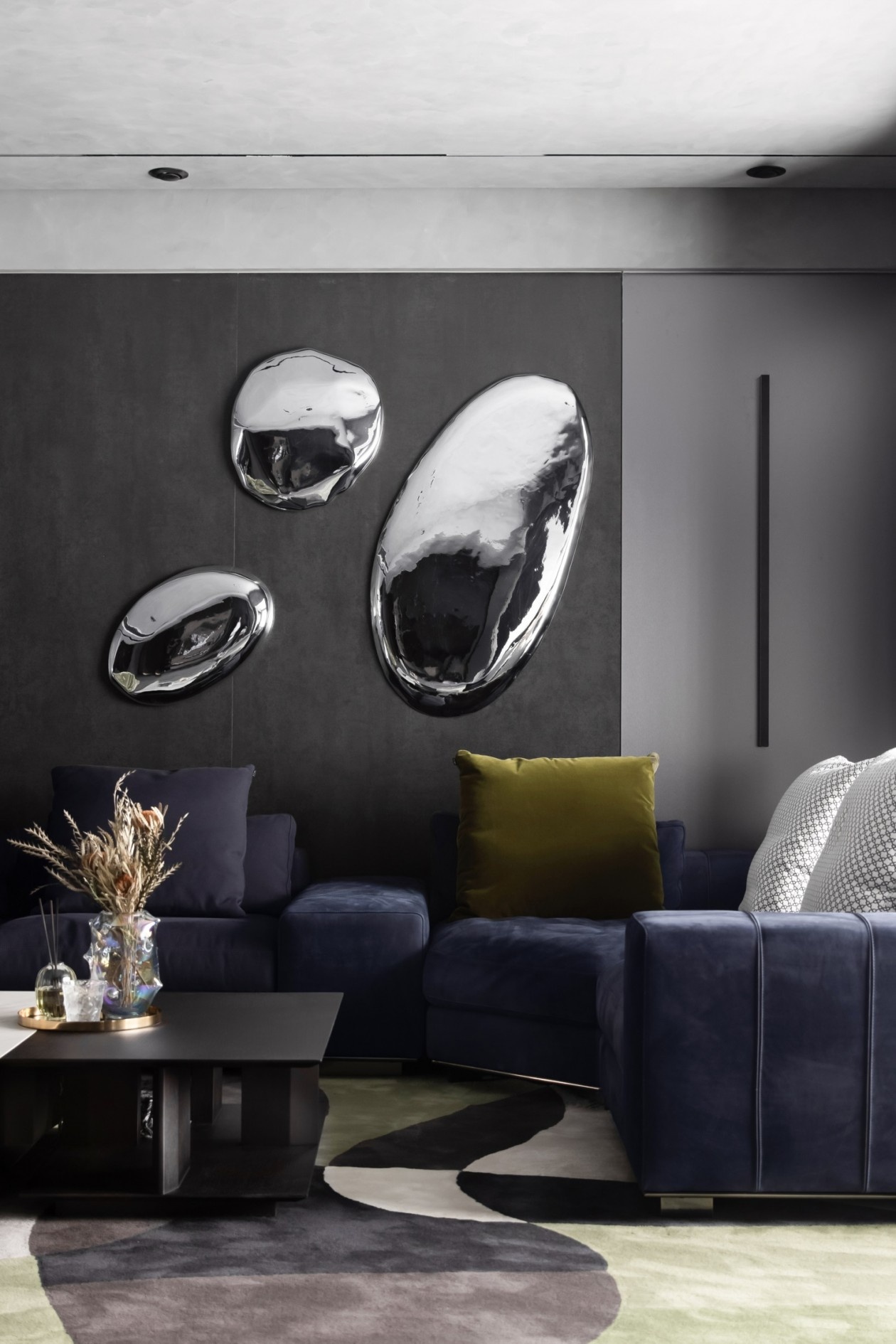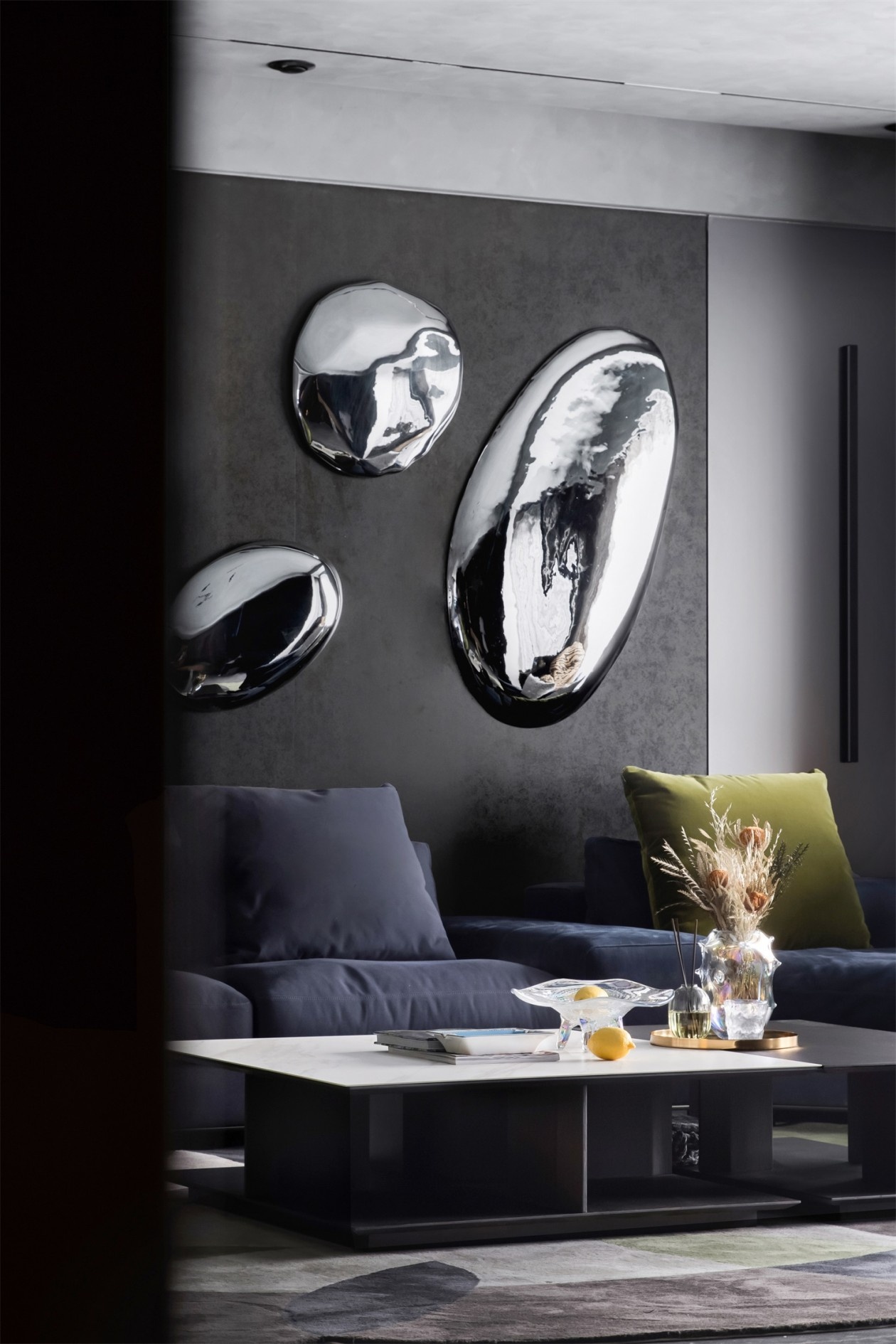 深灰与墨黑构建出沉稳的空间基底,如同高级定制的幕布,衬得那抹荧光绿的艺术感单椅格外夺目,成为视觉焦点的“惊喜炸弹”。绒面深蓝沙发的质感在光影下细腻流转,墙面金属感艺术装置如未来世界的镜面,折射出空间的多维层次。地面的反光石材与异形地毯形成材质对话,让每一次踏入都像走进沉浸式艺术展厅,奢华不再是浮夸的堆砌,而是藏在每一处材质、每一件陈设里的精致暗语。