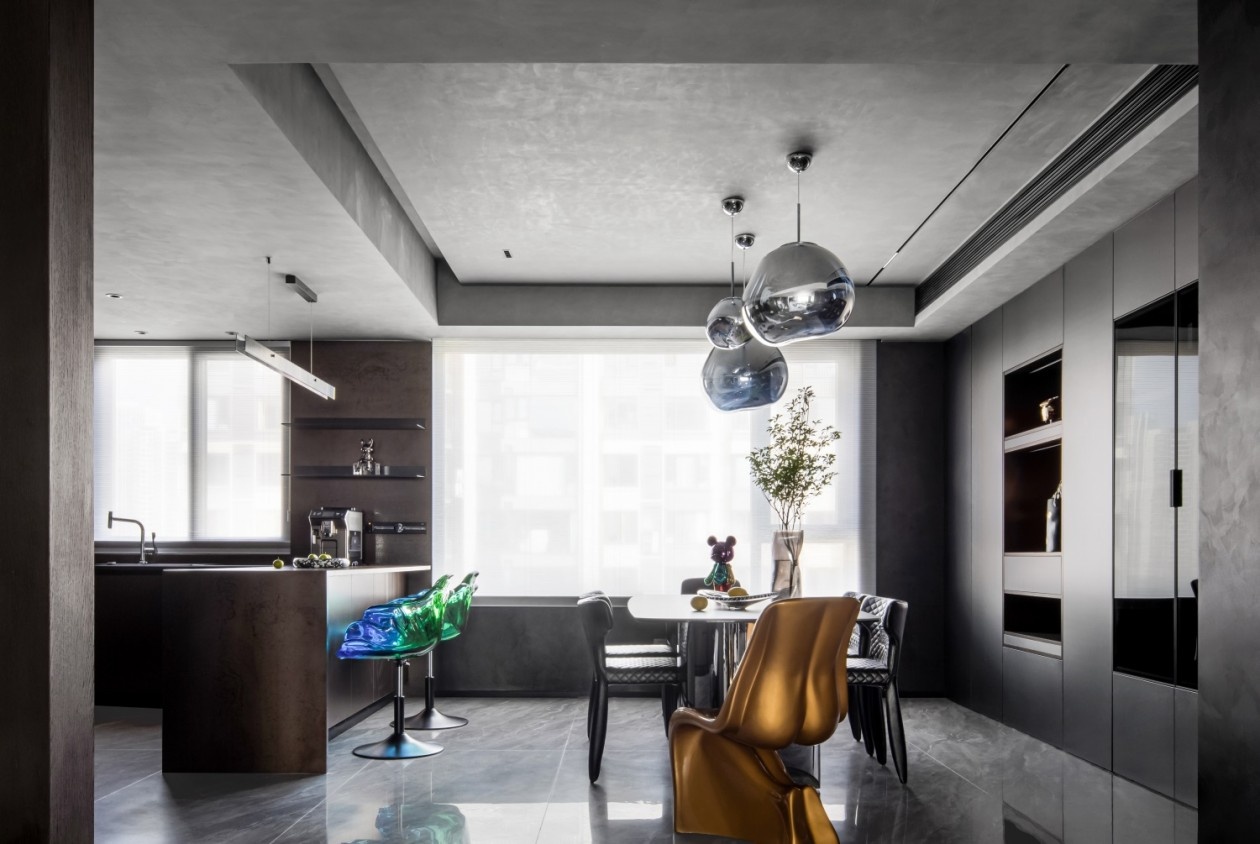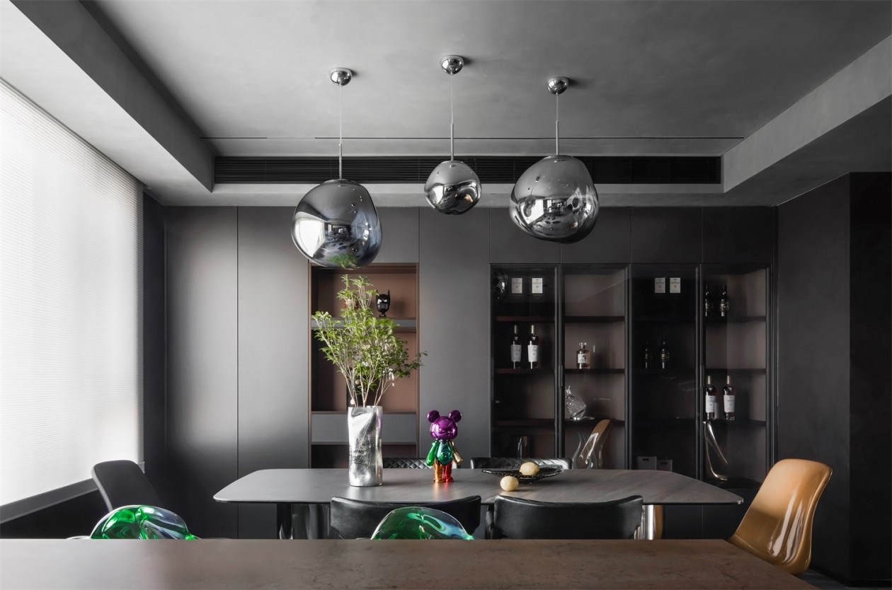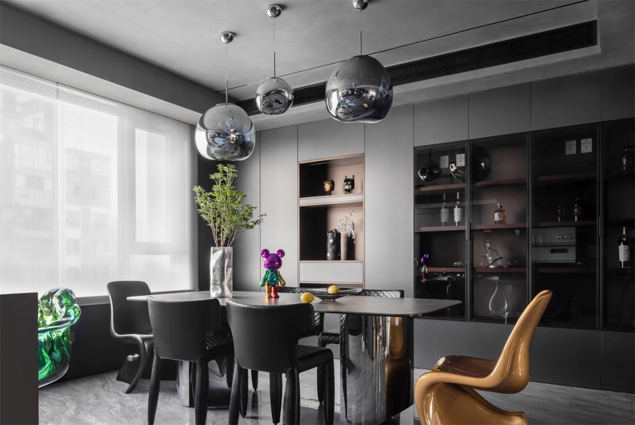 金属感球形吊灯如太空胶囊悬浮于顶,为空间注入赛博朋克式的未来感。深灰餐边柜与玻璃酒柜的组合,将收纳变为艺术陈列,藏酒与潮玩摆件在其中共生,诉说主人的多元品味。撞色的艺术座椅打破暗黑的沉闷,彩色潮玩公仔则是空间的“活力彩蛋”,让用餐时刻也充满艺术探索的趣味,极简的线条里,满是不被定义的个性表达。