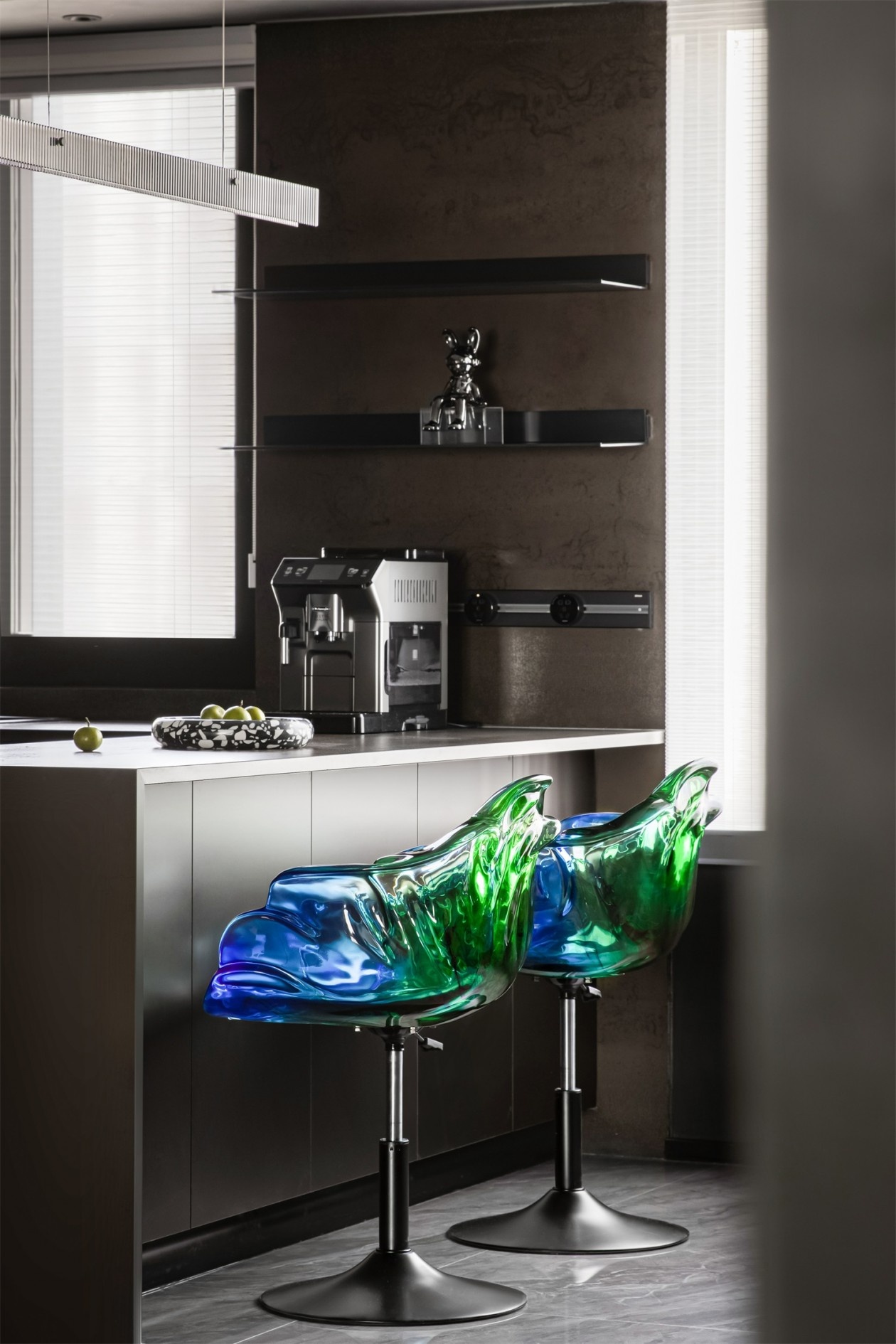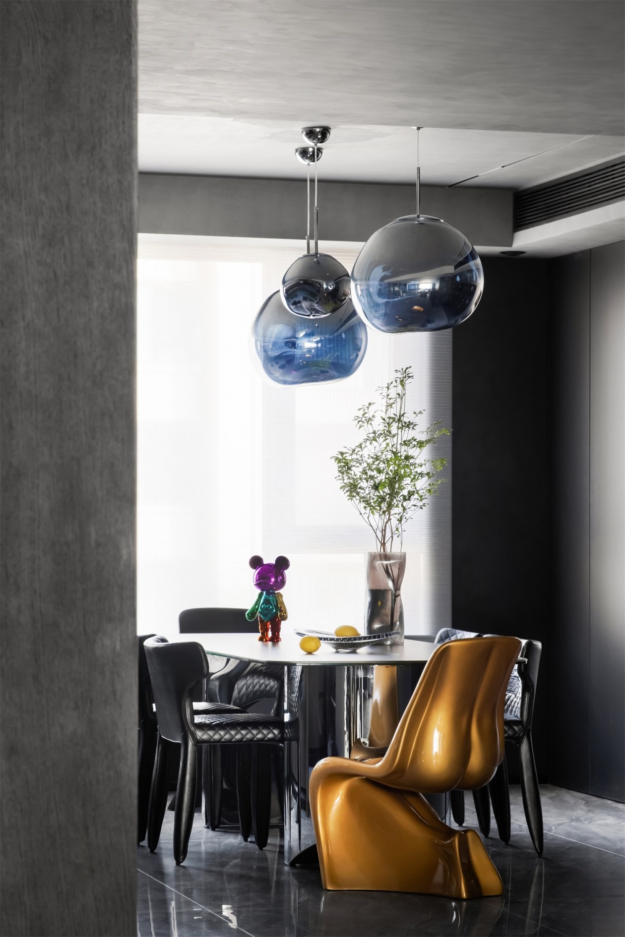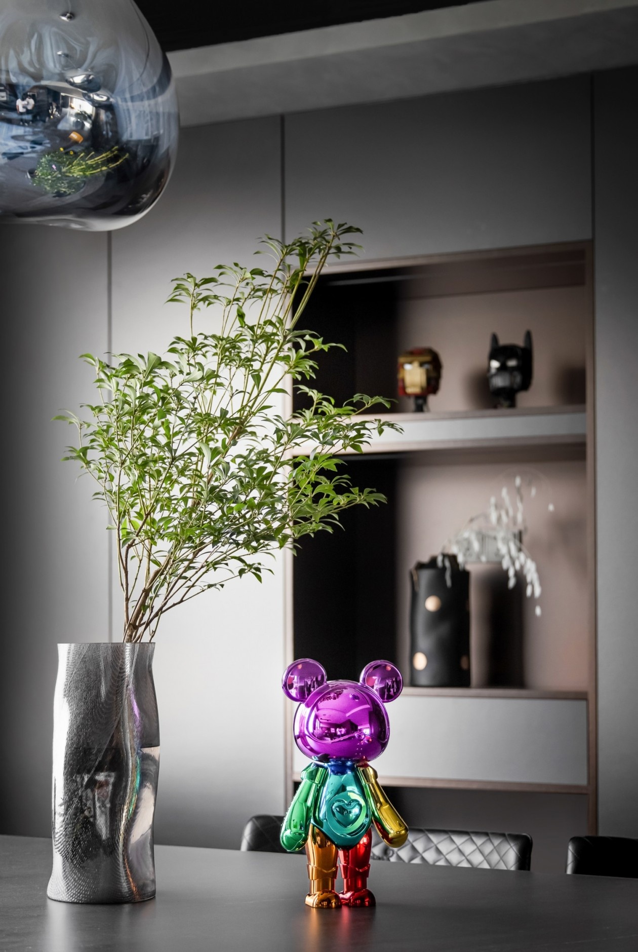 金属感球形吊灯如太空胶囊悬浮于顶,为空间注入赛博朋克式的未来感。深灰餐边柜与玻璃酒柜的组合,将收纳变为艺术陈列,藏酒与潮玩摆件在其中共生,诉说主人的多元品味。撞色的艺术座椅打破暗黑的沉闷,彩色潮玩公仔则是空间的“活力彩蛋”,让用餐时刻也充满艺术探索的趣味,极简的线条里,满是不被定义的个性表达。