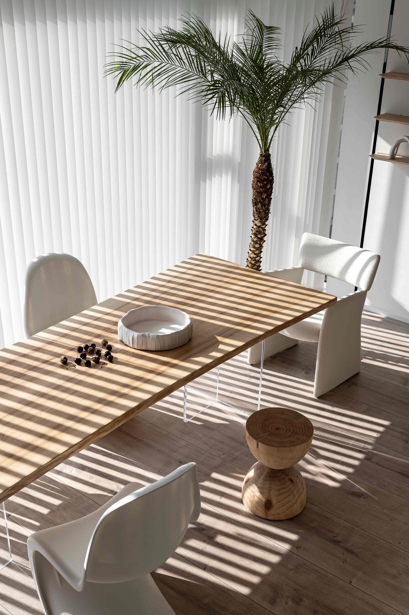 竖百叶帘滤过的光线,让餐厨区成了自然与艺术的共生地。实木餐桌质朴大气,搭配造型迥异的座椅——木质餐椅的温润、曲线单椅的灵动、布艺扶手椅的柔软,在碰撞中迸发个性。角落的高大绿植注入蓬勃生机,一旁的木色层架陈列着艺术摆件,每一次用餐,都是一场沉浸式的美学体验。