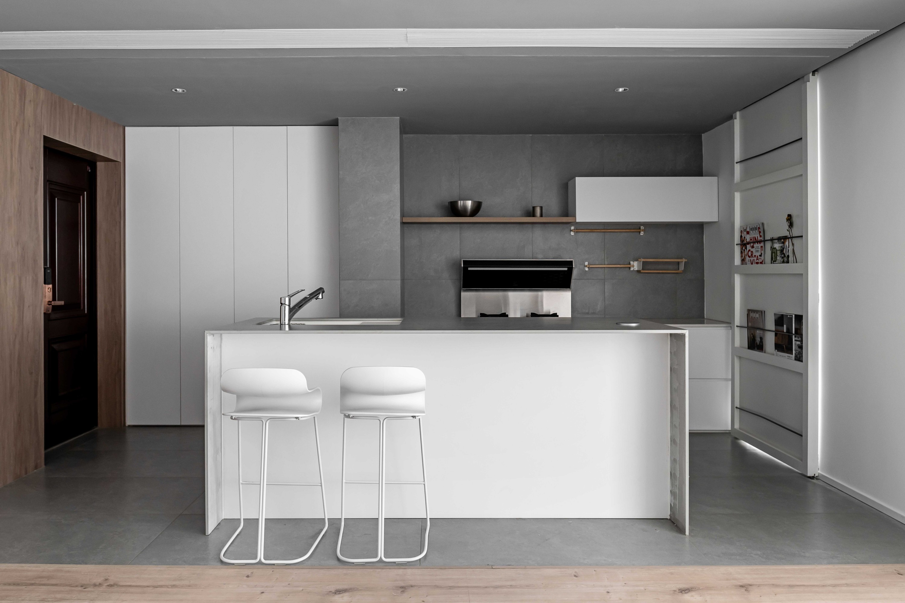 灰色调厨房以岛台为核心,白色吧台椅的轻盈线条,中和了灰色墙面与地面的沉稳。开放式收纳架上的杂志与小物,为理性空间注入生活温度;金属厨具与木色层架的搭配,让烹饪的烟火气也有了精致质感,在这里,下厨不再是任务,而是一场关于生活的创作。