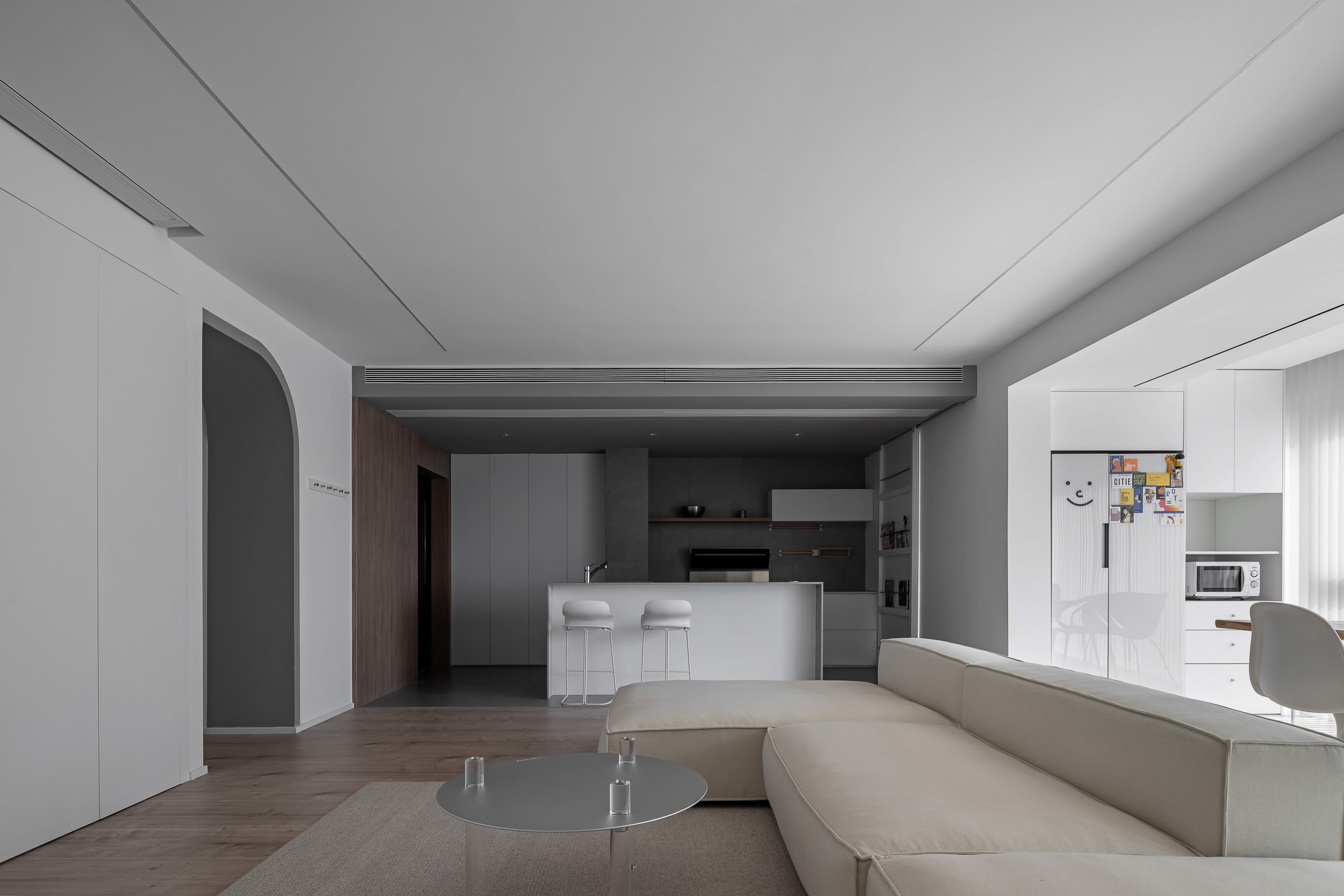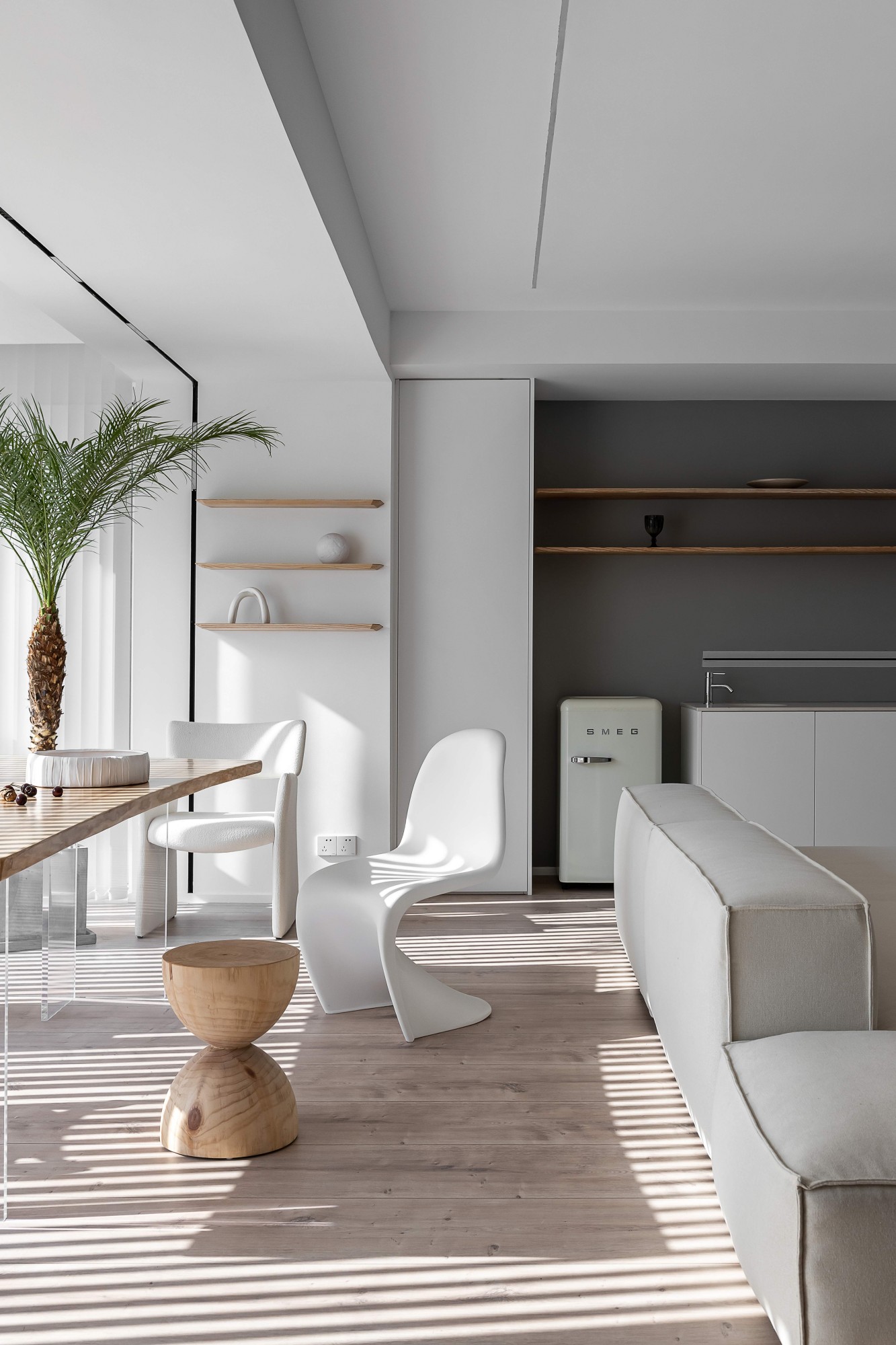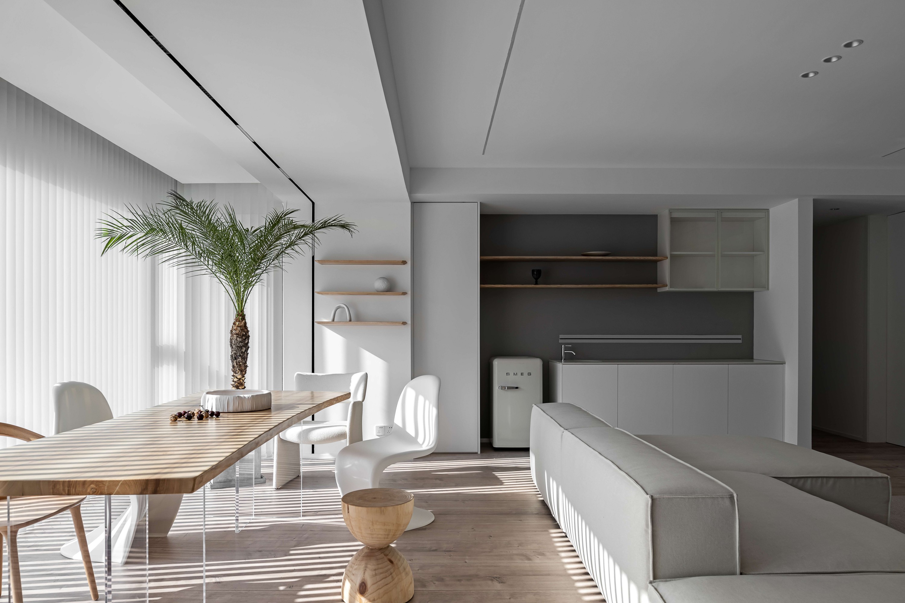 浅米色模块沙发如云朵般舒展,搭配透明质感的圆形茶几,在木质地板的温暖基调上,勾勒出松弛的会客场域。一侧的灰色餐厨区以复古SMEG冰箱点睛,木色层架与玻璃柜的组合,让收纳也成了艺术陈列;整面白色定制柜体则将琐碎隐于无形,在极简线条里,装下生活的从容。阳光透过百叶洒下,光影在空间里游移,每一处留白都是给生活的呼吸感。