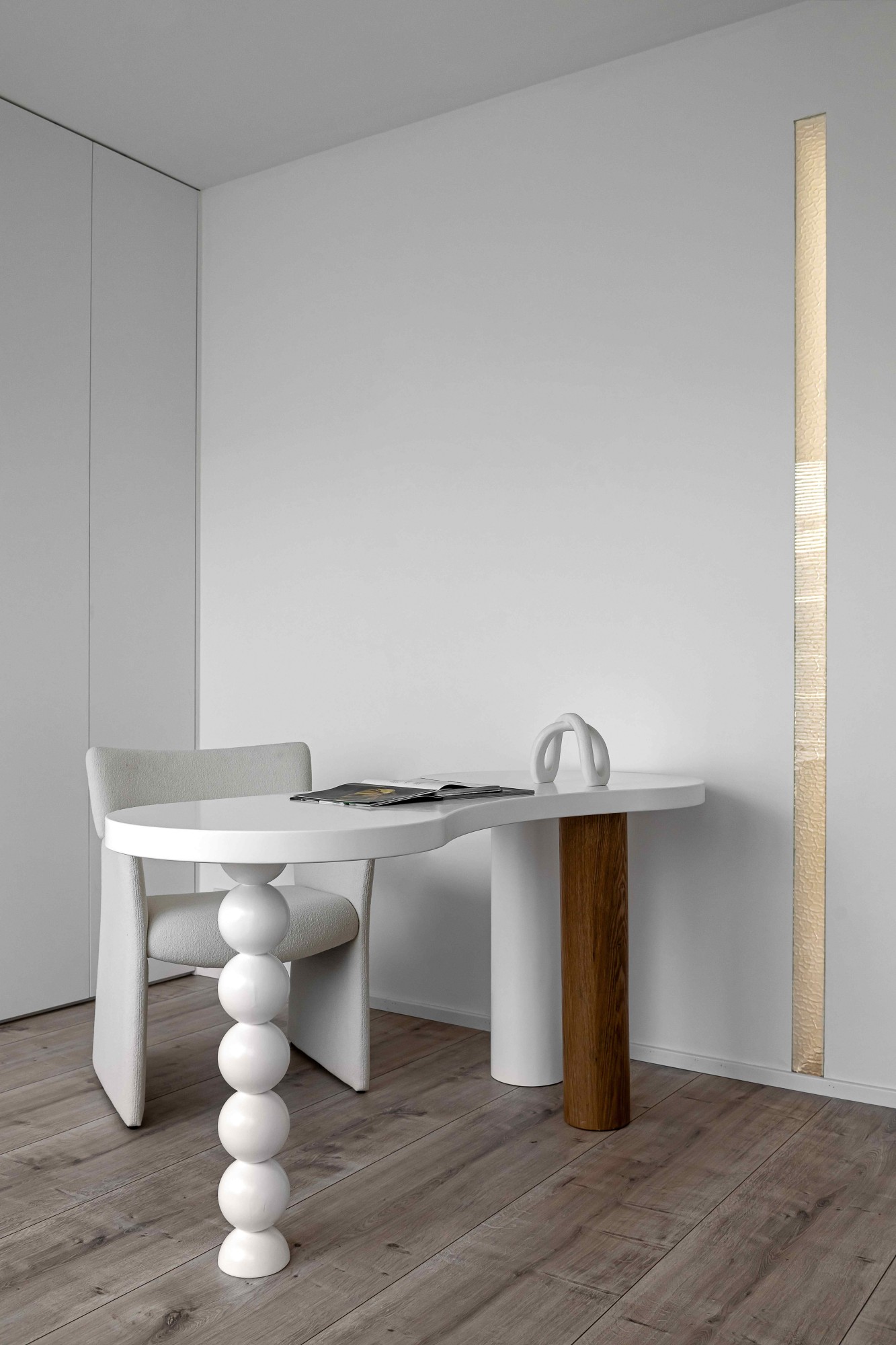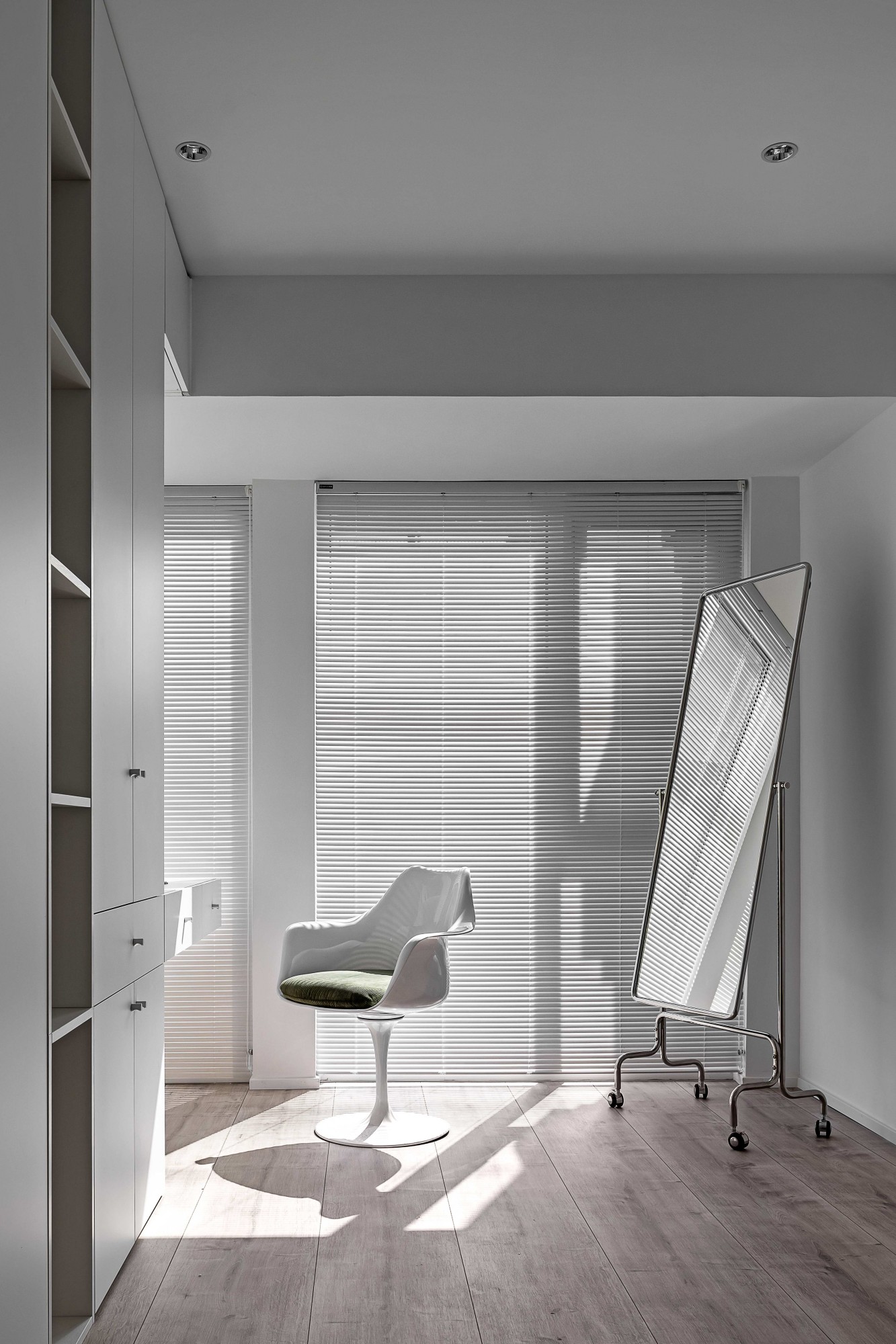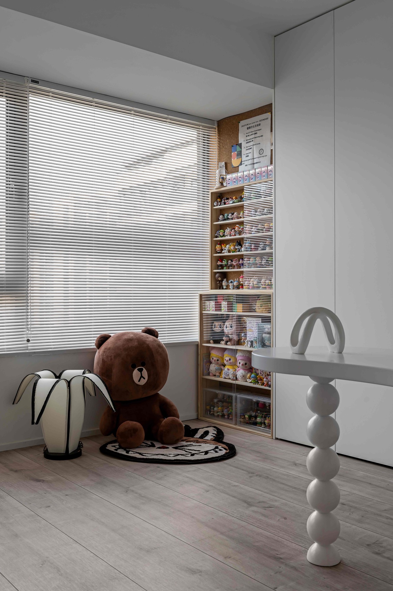 浅米色模块沙发如云朵般舒展,搭配透明质感的圆形茶几,在木质地板的温暖基调上,勾勒出松弛的会客场域。一侧的灰色餐厨区以复古SMEG冰箱点睛,木色层架与玻璃柜的组合,让收纳也成了艺术陈列;整面白色定制柜体则将琐碎隐于无形,在极简线条里,装下生活的从容。阳光透过百叶洒下,光影在空间里游移,每一处留白都是给生活的呼吸感。