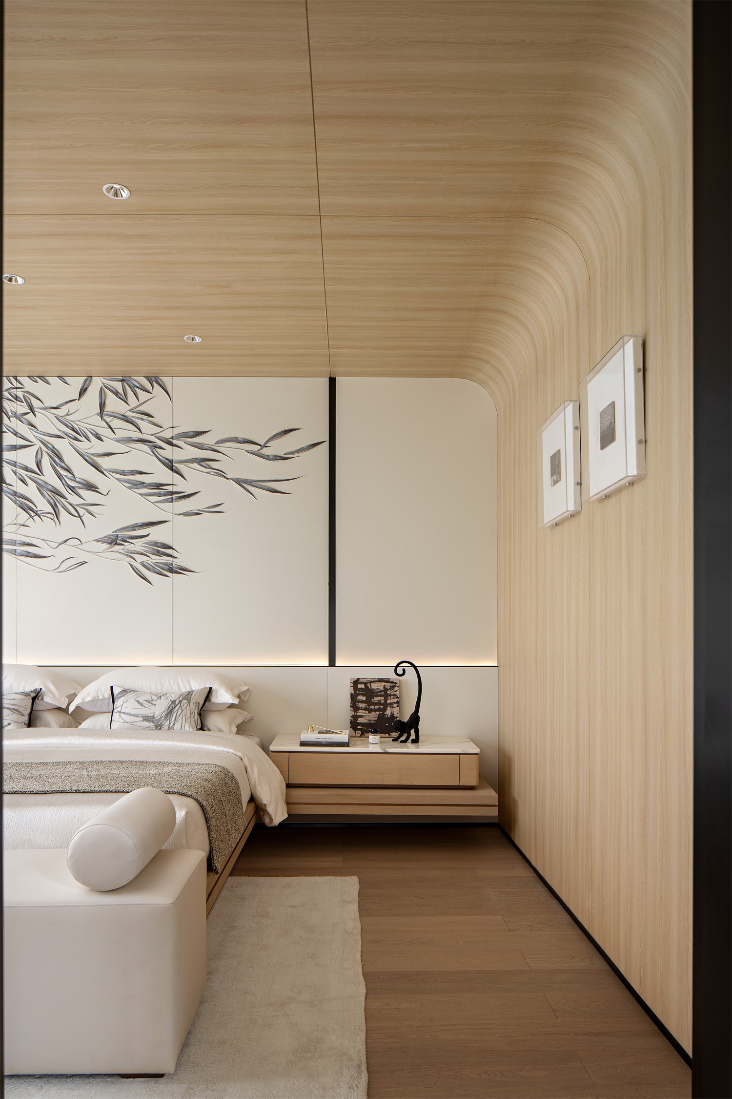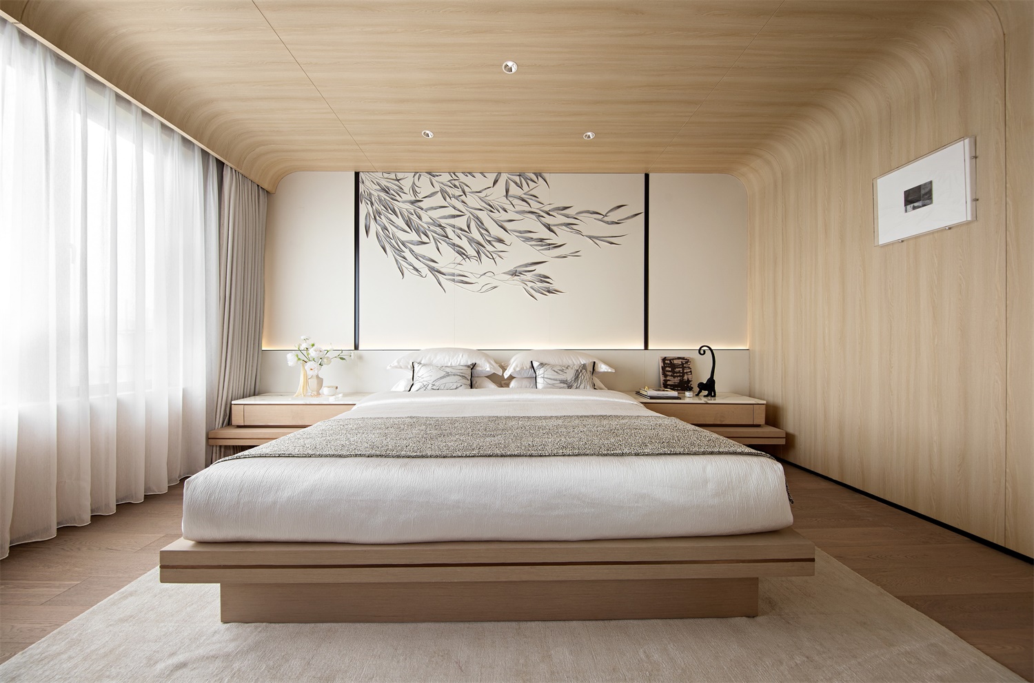 弧形木饰面打造的穹顶结构,如温柔的茧包裹住整个睡眠空间。浅木色的自然肌理与纯白床品呼应,背景墙的枝叶艺术画为空间注入禅意,在纱帘与木地板的柔化下,每一次躺卧都是对都市疲惫的温柔消解,是物质与精神的双重栖居地。