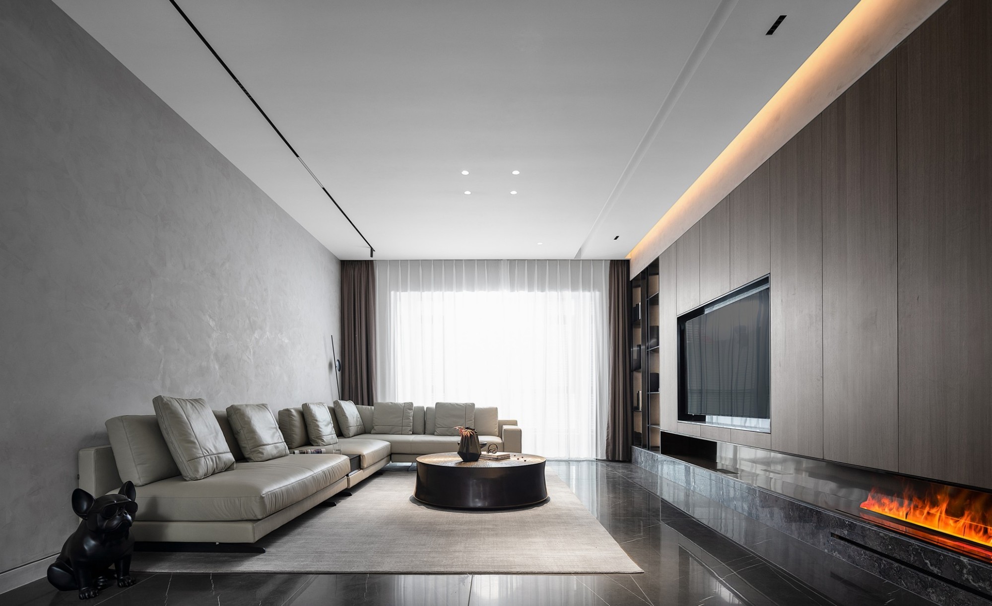 微水泥墙面的细腻肌理,与烟熏木饰面的温润质感交织,勾勒出冷静又奢华的空间调性。浅灰真皮L型沙发以慵懒姿态拥抱生活,圆形金属茶几的厚重与壁炉的跃动火焰形成张力,在无主灯设计的光影层次里,每一处细节都在诉说当代精英的品位独白。