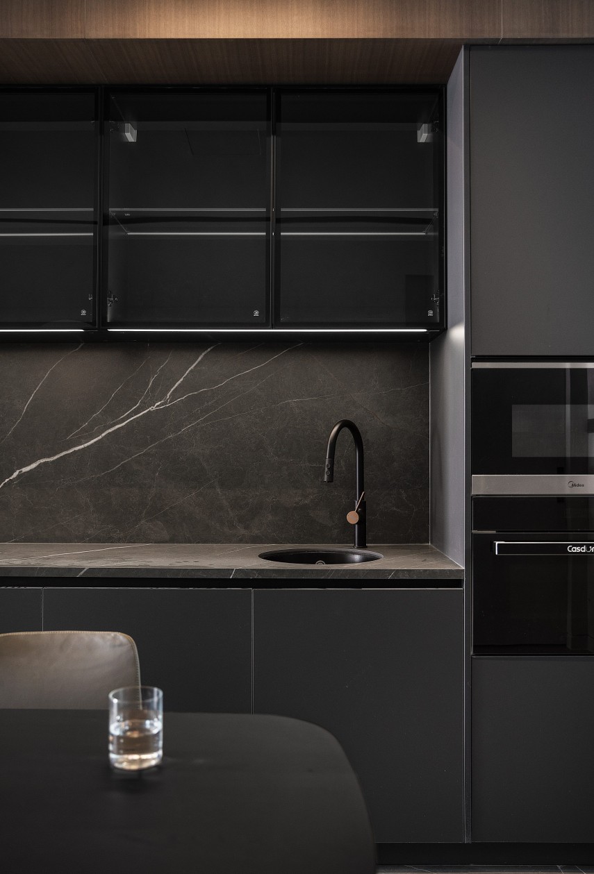 深灰橱柜与大理石纹理的碰撞,是理性与美学的共生。玻璃吊柜的通透感消解了空间压抑,极简餐桌搭配哑光餐椅,一抹酒红矮凳成为视觉跳色。开放式布局让烹饪、用餐与社交自然衔接,在利落线条与暗藏灯带的烘托下,烟火气也变得极具设计感。
