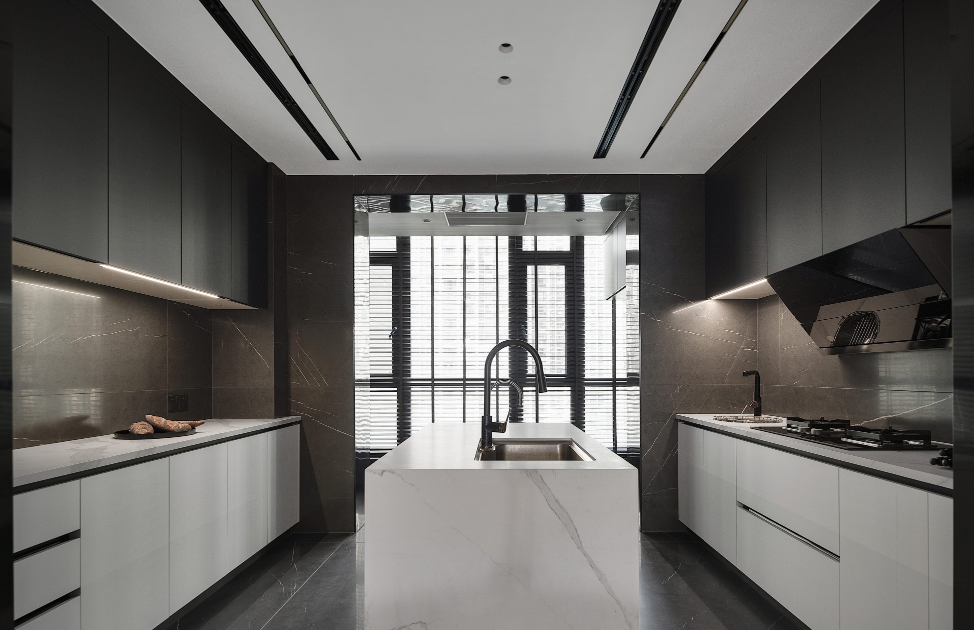 黑白撞色的橱柜系统,以几何秩序构建高效烹饪场域。中岛台的纯白大理石纹,在深灰墙面的衬托下尤为醒目,嵌入式厨电与隐藏灯带的设计,将功能性隐于极简美学,百叶窗过滤的光线洒入时,整个空间便成了现代厨房设计的理性教科书。