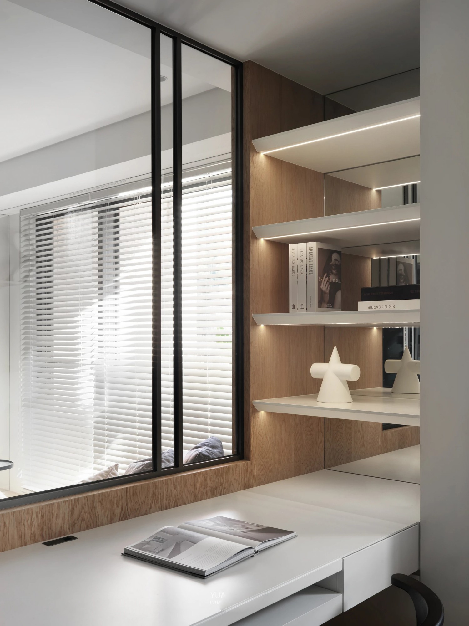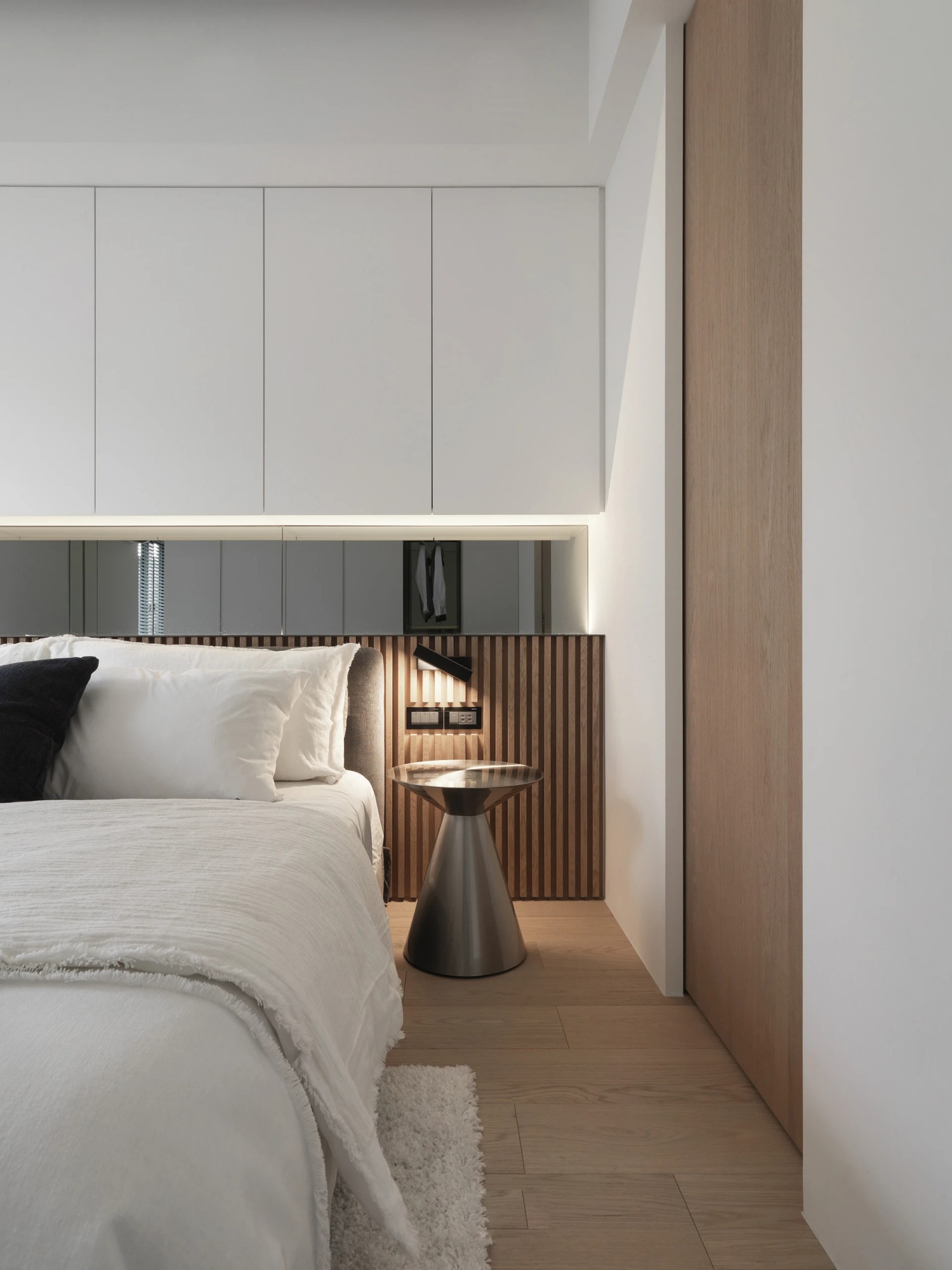 纯白基调铺就一方静谧天地,百叶窗滤过的光线温柔地洒在松软床品上。极简柜体隐于墙面,木质元素在床头悄然点睛,删繁就简的设计语言,为身心打造出毫无负担的休憩港湾。在这里,睡眠是一场与纯粹的对话,每一寸空间都在诉说“少即是多”的生活哲学。