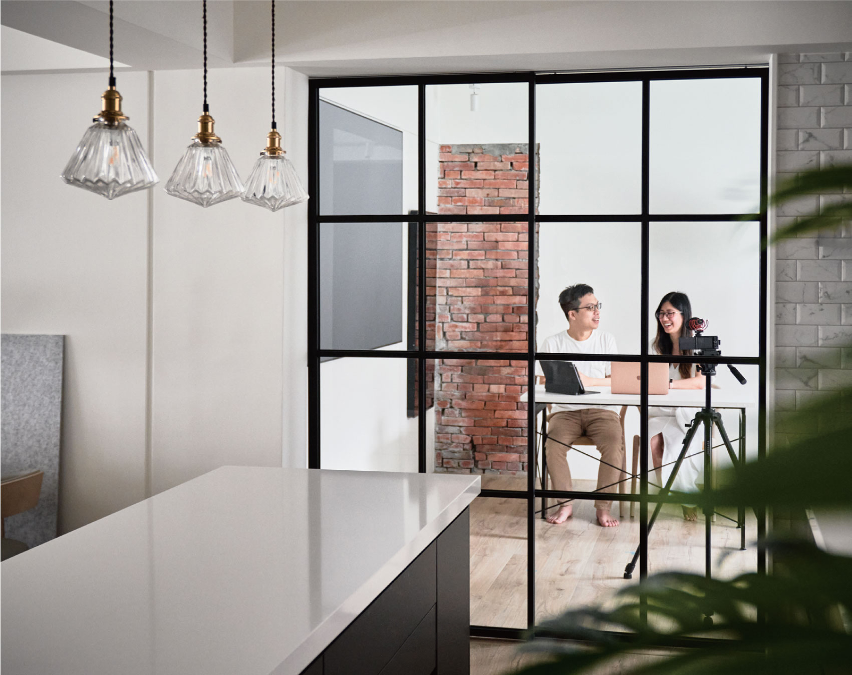 白砖墙面+黑色橱柜,是经典的“复古撞色”;裸露的水管吊灯+黄铜灯座,把工业风的粗粝和复古的精致揉在了一起;玻璃移门既不挡光,又给厨房做了“软隔断”,连置物架都选了原木色,中和了黑白的冷硬,做饭时像在“复古咖啡馆的后厨”。