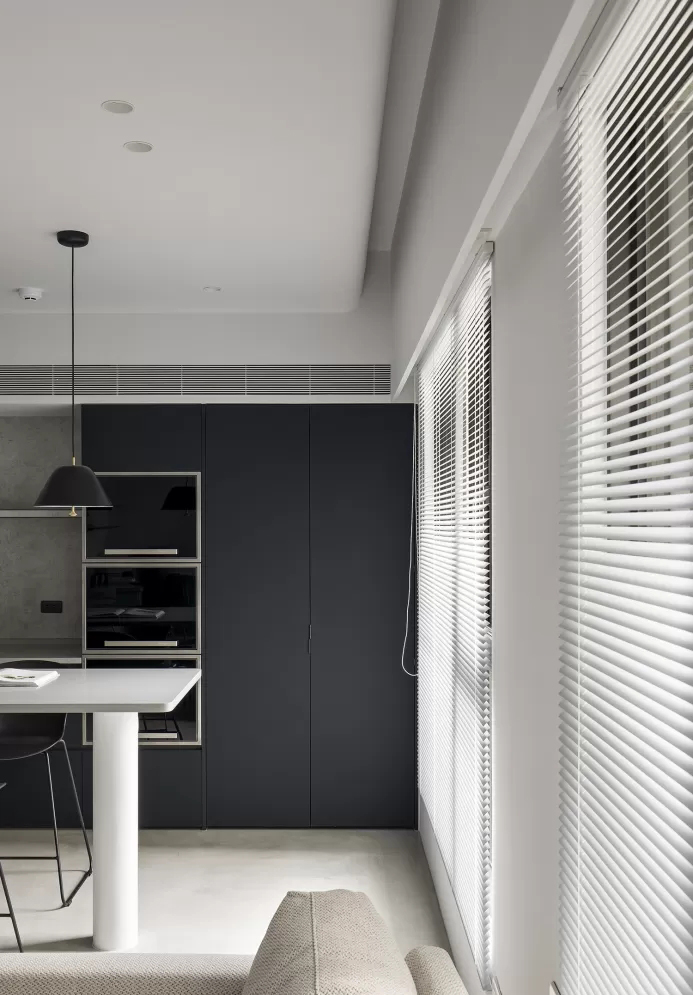 • 隐藏式储物很聪明:深黑柜门将电器、杂物藏起,中间留玻璃展示格,既保持极简调性,又能露出精致小物。