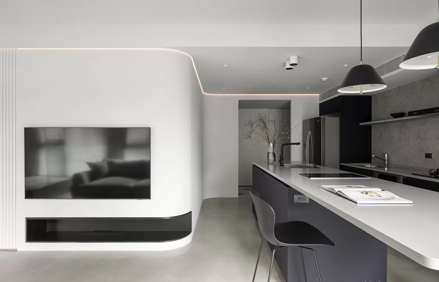 这组空间是极简工业风与柔和质感的平衡设计,用“冷调基底+细节柔化”打造出高级又舒适的居住感: