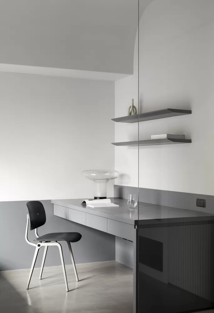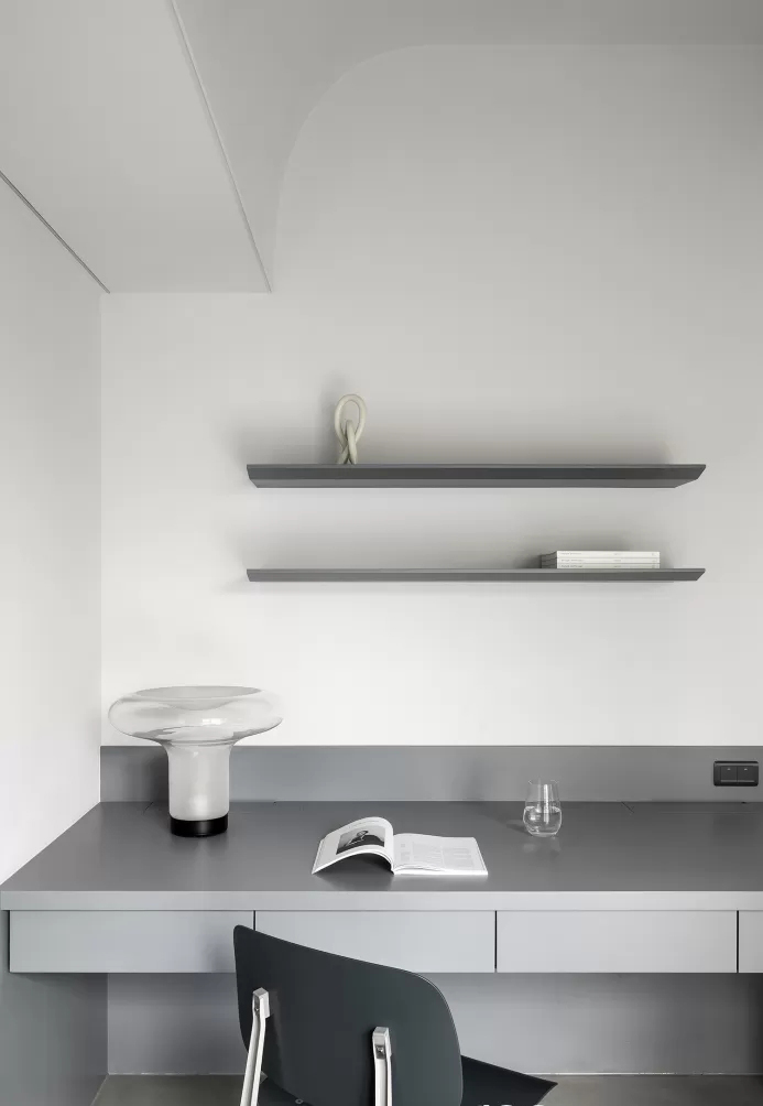 • 用百叶玻璃墙划分客厅与书房:百叶既能遮挡隐私,又不会完全隔断光线,让两个空间保持通透联动;书房做悬浮式书桌+极简层板,没有多余装饰,把“极简”落到实用里。