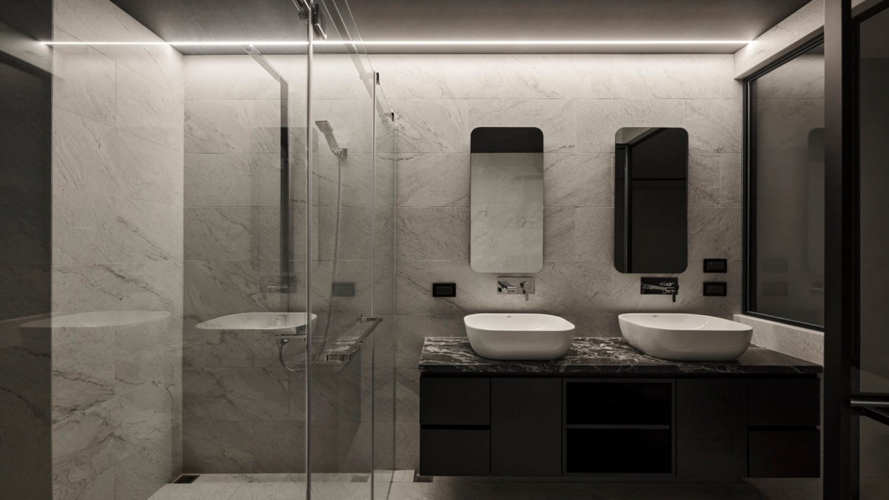 大理石纹瓷砖铺满整个空间,双台盆设计提升日常使用效率,玻璃隔断让小空间显开阔,嵌入式灯光与黑色镜柜呼应,既强化了暗黑系的高级氛围,又用白色台盆平衡了视觉重心,实用与质感兼备。