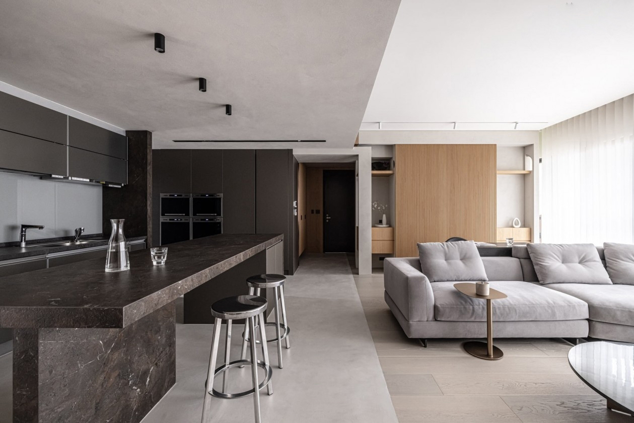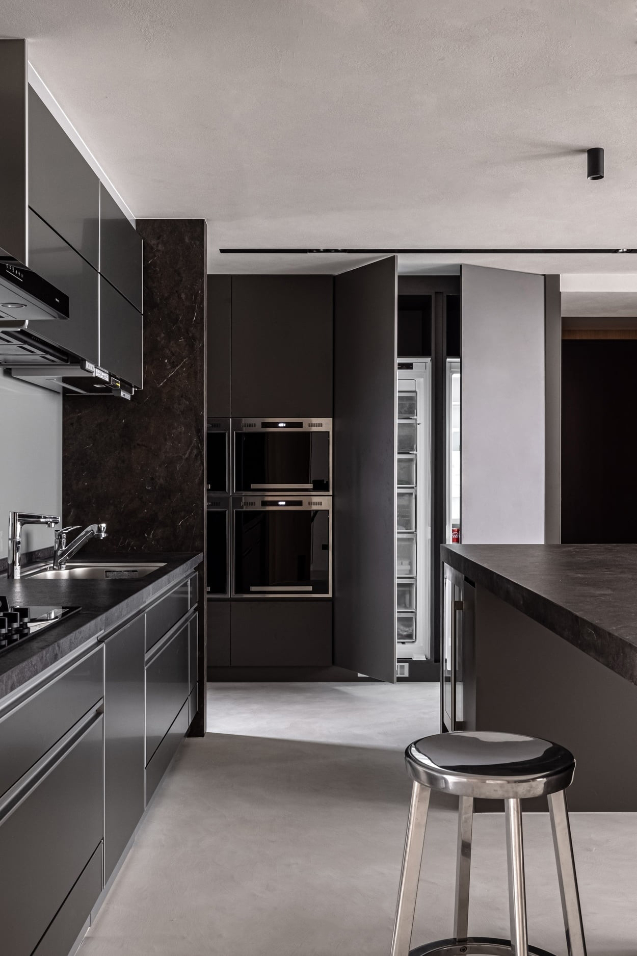 深灰橱柜+黑色岩板台面自带利落感,木纹护墙与金属小凳中和冷调,弧形转角设计柔化了空间棱角,既保留了极简的规整,又添了生活的松弛。